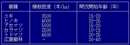 間伐のしかたはいろいろあるのですが、間伐することによって樹木の生長 をおさえることができます。間伐の作業は「どのような性質の材を生産する のか」という目的にしたがって実施されます。 間伐のしかたは、育てようとする材によるのですが、優良な大きな直径の 材やお酒や味噌の樽の材の生産では、はじめに、1ヘクタ−ルあたり300 0本の苗を植え、少しずつ間伐して長い期間をかけて樹木を育てていきます。 山陰の「智頭林業」などがその例です。 旧国有林などでは、はじめに1ヘクタ−ルあたり3000本の苗を植え、 直径のおおきな一般材の生産を行っており、1本の樹木から、長さ4メ−ト ルの材を1玉か、2玉生産することを目標としていました。この場合は、し ばしば保育間伐を行い、長い生産期間をかけて育林につとめてきました。 間伐は、開始する時の立木の本数、開始する時期、間伐する量、間伐の対 象を選ぶ方法、間伐を繰り返す期間などを考え、それに経営(生産)の目標 にしたがって行われます。苗を植えたときから伐採の時期までの間にどのよ うな間伐をおこなうのか林業家が考えることになります。(b)間伐を開始する時期は