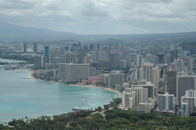 (2) 頂上からの眺め。ワイキキの中心街を見下ろす。