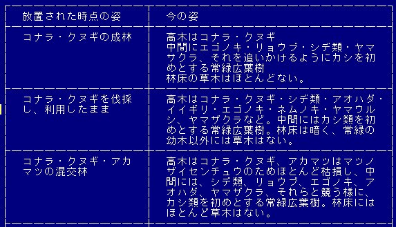 ついでに、私たちの身のまわりにある雑木林の中では、今どのようなことが 起っているのかをお話したいと思います。先日、東洋大学工学部の学生の皆さ んと所沢市下富の雑木林の中を歩きました。 学生の皆さんに、三富の開拓地の特徴を知ってもらい、農業と雑木林、コナ ラ・クヌギの人工林のこと、壊れかけている雑木林の姿、壊れ方のいろいろな 形、手入れの大切さ、典型的な三富開拓地のパタ−ンなどを学んでもらいまし た。 後で、大学の先生から学生の皆さんの感想文を送っていただきました。それ をみると、参加した皆さんが、理解のしかたに違いはあっても、何らかの感動 があったようです。 実は、この下富の雑木林を歩いてまわれば、雑木林で起こっている様々な現 象を目(ま)のあたりにすることができます。(2)三富の雑木林に見る崩壊の過程