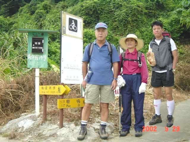 | この標識から再び草道をしばらく登って行くと満々と水を湛えたダムに出る。堤防を渡っていよいよ山道の登りが始まる。緩やかな登り道を上がって行って"龍尾"と呼ばれる林の中の峠に到着。文字通り龍の尻尾のつもりか?↓変な飾り物と一緒に記念撮影!ここ龍尾が中継点となり直進は昨年8月に行った"二浪灣"、左手が"大浪灣"、右手の階段を登ると今回目的の"老人山"経由"貝澳"方面へと至る!↓ |