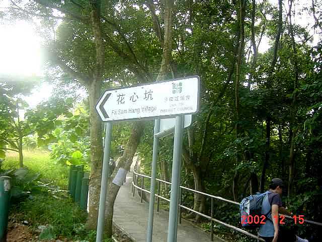 | ↓黄泥頭のバス停広場からちょっと上がった所にある標識で記念撮影!逆光で写りが悪かったッ!この標識の右側は"大葷(Tai Che)"、左側が花心坑方面となっているが我々は大葷方面へ進んで直ぐに間違いに気付く。近所の人に聞いて改めて左側、花心坑方面へと仕切り直し。舗装された小道を登って行くと間もなく東屋と標識が有った。どうやらこの辺りが花心坑らしい↓?さらに登って行くと前方に岩山が、↓ |