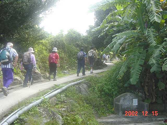 集合した9名は沙田からタクシ-で先ずは"黄泥頭(Wong Nai Tau)"まで。沙田の駅タ-ミナルからバスも有るようだが、9名でタクシ-2台に分乗するとバスよりもこちらのほうが安くなるし何より時間短縮にもなる。沙田の川を渡り大老山遂道を行くとタクシ-は間もなく黄泥頭に着く。直ぐに"花心坑(Fa Sam Hang)"方面へ至る道もわかり、村落の間を抜けて登って行くと登山口も見つかった。徐々に傾斜もきつくなるが林の中を登って行くと間もなく"女婆アウ(Nui Po Au)"の峠に到着。ここで道は梅子林へ抜ける道と左手の目的地、女婆山への道に分かれる。 ここからが本格的な急坂登りが続くがそれも僅か20分ほど。岩の間を抜け、肩に着いたら冷たい風が吹いていた。頂上からの眺めは意外にも素晴らしく真下の沙田の街並みや、北側の"吐露港(Tolo Habour)"の海、東側には"水牛山(Buffalo Hill)"や"石芽山(Shek Nga Shan)"など馬鞍山麓の雄大な山並みが目前に迫る迫力!心配していた北側下山ル-トも直ぐに解り稜線沿いに下って行くと沙田の街が徐々に近づく。最後は"突破青年村(Breakthrough Youth Villege)"と云うカトリック関係の施設の近くにFinish。僅か6q程の歩きだったが手近でなかなか良い山行きでした。 |