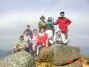 | 頂上での恒例の↓記念写真。しばし周りの風景を楽しんでいたら寒くなってきた。北側ル-トに沿って下るともう一つのピ-ク!そこも頂きは大きな岩だらけ!馬鞍山をバックにワンショット!岩の上での逆光写真!以前歩いた馬鞍山麓西側の山並を望む |