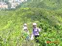 後で地図を最確認したら結果的には"松山(Chung Shan)"と呼ばれる箇所から歩き出したようだ。登山口近くに豚のラ-ドを抽出している小屋が有った。階段を登って高度が増すにつれル-トは荒れ道となり、如何に誰も歩いていないか良く解る。最初の峠の上に立って真下の谷とその先前面の圓頭山を見上げると、ル-トは全く見えず頂上付近はかなりの断崖絶壁!こりゃ-ここからの登りは無理かな?と思案!思案! 意を決してジャングルの谷に降り、ヤブ漕ぎ登りの開始!ル-トは殆ど不明!何とか肩付近まで辿り着く。手足はキズだらけ!それからが急傾斜の斜面を這い登って先ほど見えた岩場付近まで到達。岩にへばりつく様にして登って行ってやっとの思いで頂上375mに到達!!頂上からの眺めはこれまた絶景!滅多にこんな景色は見れない貴重な眺めだった。体力気力を消耗した我々は予定の"乾山"行きを諦め、ル-トがハッキリ見える北側の元朗(Yuen Long)方面を目指して下山。 小さなアップダウン繰り返しの長〜い下山ル-トが続いた最後、降り立った場所はどうやらコンテナタ-ミナルがある"厦村"(Ha Tsuen)と呼ばれる村落付近らしい。舗装道路を30分以上も歩いてやっと流浮山路(Lau Fau Shan Rd.)のバス停に着いてFinish。約9qの歩きだった。元朗〜銅鑼灣とバスを乗り継ぎ最後日本食店で3日間の山登りの総括とばかり盛大な打ち上げで終わりました。 |