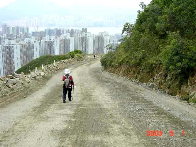 | 鷓鴣山から下山して降り立った清水湾道、ここからタクシ-で同じく清水湾道の"井欄樹"(Tseng Lan Shue)まで戻る。WST-3-を逆行して村落を抜け"大牛湖"(Tai Ngau Wu)付近まで来る。道の右側の草むらに大上托への登山口らしき草の倒れを発見!ここから登りだす。結果的にはこのル-トが正しかった。そして遂に頂上419mに立つ。香港島を真正面から眺める景観!頂上から直ぐ南側一帯は既に石切場として崩されこの山は東北側半分しか残っていなかった。祭日で工事は休みらしく人影が無い事を幸い我々は工事用のブルト-ザ-が通る道を下山、最後は"寶琳路"(Po Lam Rd.)の車道に出てFinish!ト-タル10q程の歩きでした。最後の打ち上げは"觀塘"(Kwun Tong)で。 |