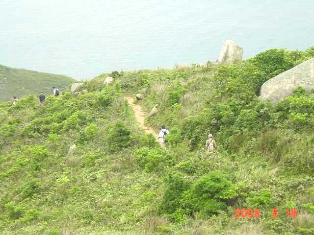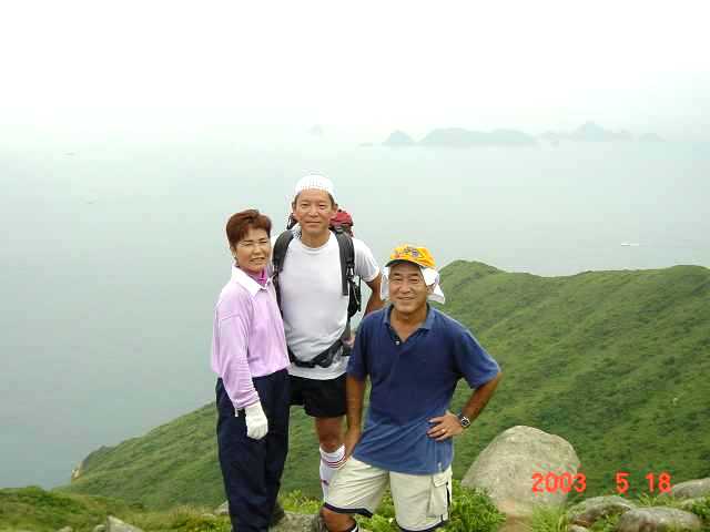 大拗門(Tai Au Mun)から20分程舗装道路を歩き大坑敦(Tai Hang Tun)と呼ばれる郊野公園センタ-からいよいよ登山ル-ト。30分程で"大嶺恫" 291m頂上に立つ。遠景が霞んではいたが真下に広がる海と四方の景観を楽しむ。下山コ-スは半島の北端にある龍蝦灣(Lung Ha Wan)までの下りル-ト、景色を楽しみながらの歩きが続く。海岸まで下山し岩場でしばしの休憩。その後は半島を周回するように続く長〜い舗装道路を約30分、最初の大拗門まで戻ってFinish!引き続き送別宴会の会場へミニバスとMTRを乗り継いで直行! |