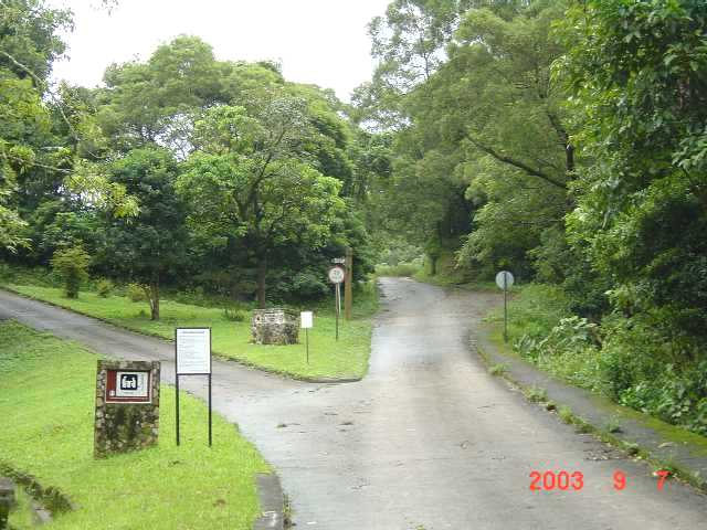 ↓出発点の城門水塘入口、ここの下までミニバスが来る。これよりパイナップルダム自然教育徑(3)と呼ばれる城門水塘の西側をダム湖に沿って歩く。階段を登ると舗装路。右手の下り坂からユ−カリ林の道を散策。雨上がり、樹木の緑が映えて美しい! 先日来の台風や最近の雨でダムの水は満杯、岸辺の木も根っこが水没していた。