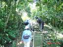 ↓“馬鞍山村”の公園ゲ−ト前。KCR“大學”からタクシ−3台に分乗して来たが、他の2台はここの公園を通り過ぎてしまった。4人は舗装路をとぼとぼウォ−ミングアップ! 舗装路の突き当たり、登山口で全員揃って記念写真。これより“馬鞍山”登山ル−トの山道を登り出す。小沢を越え林道を登って行くと左手に姿を現した標高702m“馬鞍山”の威容! ダラダラ坂道だが既に汗が噴出してきた。今日は暑いッ! ↓間もなく“昂平高原”の入り口、MHT-4-の中継点に到着して小休止。後ろの山は“大金鐘”(Pyramid Hill)。これより“昂平高原”の始まり、ここはいつ来ても気持ちの良い高原だが今日は特に天気もよく、そよ風に吹かれながらの散策、、、途中展望台に立ち寄って“西貢”の海や“ピラミッドヒル”と“馬鞍山”の山並みを眺める。引き続きMHT-4-を歩き、、、、、 ↓間もなく“大水井”方面への中継点を通過。ここからは“石芽山”を正面に、左手遠方には“白沙灣”のヨットハ−バ−を眺めながらの山麓の歩きが続く。徐々にコ−スは下り坂となって、林道の階段を下ったら昼寝中の牛チャンが、、、 ↓そこは“芽坪”の標識点だった。MHT-4-はここの広場から登り坂となって“水牛山”(Buffalo Hill) 方面へ至るが、今日の我々はここでMHT-4-を外れて右手の“梅子林”へ向かって下り坂を行く。この森林道は鬱蒼と茂る樹木で覆われ昼なお暗きジャングルの様相! 長い石段の下りが続くが所々コケが生えた雨上がりの石段は滑り易くてかなり神経を使っての下り道。一しきり下ったら大きな沢、、、沢に掛かる小橋を渡ってさらに密林の道を行くと、、、 ↓すぐに平道となって進行方向が“富安花園”の標識、これは“梅子林”の先にある団地のこと。間もなく“梅子林”の村落に差し掛かる。左手上の方に見覚えのある岩山! あれが“女婆山”の手前の岩山だ。民家の脇を通り抜けて畦道を行くと沢に出た。ここからが“花心坑”経由“沙田”方面へ抜ける昔の旧道。沢を渡ったら森の中の長〜い登り坂が続く。 ↓汗ダクになって登って行くと標識がある三叉路に出た。ここが“花心坑”から“女婆山”への登山ル−ト、"女婆アウ”の“牛凹”と呼ばれる峠だ。小休止の後いよいよ右手の急坂を登り出す。すぐに先ほどの岩山が目前に! 大岩の脇を必死に登る一行、、、そしてやっと肩付近の丘に到着。急坂だったが距離は短い。ここまで来たらピ−ク三角点も間近、、、そして頂上を目指す。すぐ後ろには“石芽山”。 ↓頂上付近は赤土のガレ場、周囲には青空の下素晴らしい景観が広がる。東には雄大な“馬鞍山”の山並みとその手前は以前歩いた“鹿巣山”(Luk Chau Shan)、そして右手には“石芽山”の切り立つ稜線と今歩いて来た尾根道。西側下には“沙田”の街並み。その遥か彼方には微かに“大帽山”(Tai Mo Shan) も見える。記念写真を撮って北西方面に向かって下山開始。 ↓ピ−クからの下り、地図上では二つの点線ル−トがあるが今日は前回とは変えて一つ手前の尾根を下ってみる。殆ど赤土ガレ道の下り坂が続く。徐々に近づく“沙田”競馬場! 30分程も下ってきたら道はやがて林の中に入り、間もなく見覚えある建物と金網。前回はこの建物敷地内、つまり金網の中に紛れ込んでしまったが、今日は金網外側の道に出て直ぐにバス道路に降り立った。この建物は“突破青年村”と云うカトリック関連施設。幸いにも直ぐにミニバスが来てKCR“沙田”駅に直行。 ↓“沙田”駅に隣接するショッピングモ−ル、その中のお馴染み上海レストランに飛び込む。ここは料理も美味く、値段も比較的安い! しかし今日のショ−ロンポ−はちょっと失敗作か? 皮が固くていつもほど美味くなかったな〜? |