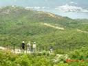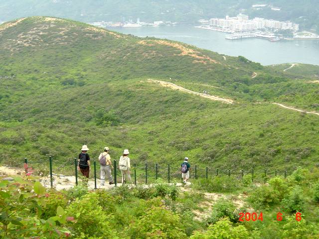 ここが、かの有名な?"懺悔の坂道"! 両脇の樹木の幹に取り付けてある十字架を見ながら仲間達は各々長い坂道を登ってやがて“聖母マリア像”がある小公園に、、、さらに“三途の川”? を渡った階段の上の修道院に到着。丁度ミサの時間で我々も“ホンノ気持ちだけ”参列。“懺悔の告白”を終えた我々は今度は修道院から森の中の小道を抜けて無名ピ−クの小高い丘を目指す。鬱蒼たる樹木の中、セミの鳴き声を聞きながら再び長い舗装坂道が続く。汗ダクになって最後の階段を登り無名ピ−クの東屋まで辿り付く。300m以下の低山ながら素晴らしい眺めッ! ここで小休止をとった後、我々は二手に別れて先ず本隊は真下の美しい“銀鑛灣”(Silver Mine Bay) を見下ろしながら“梅窩”(Mui Wo) の街を目指して下山コ-スをとる。一方、別働隊の方は一旦今来た階段を下って北側、もう一つの275mの三角点があるピ-クを経由して渓谷沿いに “梅窩”を目指す。本隊は坂道下りから階段の下りと続き、やっとビ-チ脇の“東灣頭”(Tung Wan Tau) に降り立つ。海水浴客などで賑わう海岸道を抜けて“梅窩”フェリ−乗り場近くの海鮮レストランに着いて今日の歩きをFinish、約5.5km。直ぐに別働隊も到着、いつもの様に海鮮料理とビ-ルで賑やかに最後の〆としました。 |
