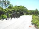↓MHT-1-スタ−ト地点の“北潭涌”にて[写真No.01]。ここから舗装路平道歩きの始まり! 1q程歩くと“萬宜水庫”の最奥部 [03]、この東屋から左手に行くと“西貢西灣路”(Sai Kung Sai Wan Rd.) となって“西灣亭(吹風アウ)”へ至る。MHTは右側“浪茄”方面へ[04]、、、間もなく目が覚めるような紺碧の貯水池“High Island Reservoir”を左手に眺めながらの歩き。向こうの山は[06] 以前登った⇒“大蛇頂”(Tai She Teng)。炎天下、見習いお巡りさんの訓練か? 少年達の元気なかけ声![07] ↓さらに2q程歩いて“元五墳”(Yuen Ng Fan) 手前の三叉路[08]に到着して小休止。これより右折して直ぐに登り口を上ると以前歩いた⇒“Pai Tau Tun”へ至る。東屋を出て直進すると直ぐに右側に広がる海峡は“深篤門”(Sham Tuk Mun) だ [10]! 綺麗な海をバックに記念写真一発! 貯水池の遥か彼方には我々の行き先、二番目のダム堤防が小さく見える[12]。“大蛇頂”を正面に望みながら“元五墳”ダム堤防の上を歩く[13]。右手は“Chong Hing Water Sports Centre”と呼ばれる海を塞き止めて人口湖にしたヨット等水上娯楽場[14]。 ↓その堤の先、海の向こうの写真右手[15] は“馬鞍山”(Ma On Shan)。堤防途中から振り返ると“大枕蓋”(Tai Cham Koi) [16]。 堤防を渡り切って更に平坦な舗装道路は続く、、、これからが本当に長い道のりだッ! 途中、綺麗な湖をバックに写真撮ったり、快晴の空の下、紺碧の湖の向こう“シャ−プピ−ク”の雄姿を望んだり[20]、、、、炎天下の歩きは続く、、、。 ↓この人造湖 [22] は鉱物質の水質とか? でこんなに青く見えるが、高い所から望むと鮮やかな ⇒緑色に見える。今まで左手(北側) に見えていた湖がしばらく山に阻まれて見えなくなる。コ−スは緩やかな上り坂、、、今度は逆に右側 (南側) の視界が開けてきた。展望台から望む遠くの海は“沙橋頭”(Sha Kiu Tau) 辺りの湾か [25]?、、、間もなく右手に下る標識 [27] “東Y村”(Tung A Village) を見て地図で確認するとどうやら間違いなさそうだ! 今度はコ−スはやや下り坂となり、、、、、 ↓又もや左手に現れた真っ青な“High Island Reservoir”! この辺りが“岩頭”(Ngam Tau) か? 随分近づいた二番目(最後) のメインダムを背景に写真一発 [30]! 再度右手に見えた湾が今度は“白[月借]灣”(Pak Lap Wan) [31]、標識表示は“白[月借]村”(Pak Lap Village)[32]。ここでしばしの小休止! さらに前進して次なる右手の湾は“白[月借]仔”(Pak Lap Tsai)[34] と先ほどの“白[月借]灣”遠景[35]。 ↓コ−スは緩やかに下りながら、、、左手湖の遥か後方には歩いてきた最初のダムとその向こう微かに“馬鞍山”[37] も。 さぁ〜ついに最後二番目のダムに到着だッ[38]! ここまで約9q、3時間近くかかった。ダム手前の記念碑の横の階段を登って[39] いよいよ“花山”209mへ向かう一行。途中、高度を上げながら振り返るとメインダム[40]、 その右手海側の緩衝堰堤[41]、そして有名な“破邊洲”(Po Pin Chau) の一端[42]。島を斧で断割ったような奇形! ↓階段登りの後はかなり急な坂登りと続く [43]。“破邊洲”手前の“双洞”(Twin Caves)がある岬[44]。“花山”は頂上に近くなると肩を過ぎた辺りからブッシュ、ヤブが増えてきた。そして汗ダクになって209mのピ−クに立つ[46]、[47]。反対側 (南西) に広がる素晴らしい光景! 瀬戸内海を思わせる大小数々の島礁![48]、[49]。 こんな美観は滅多に拝めないよッ! ↓そして海側に向かって下山開始! ブッシュだらけの坂を下ると直ぐに肩、ここで美観をバックに記念写真 [51]! 後は順調に麓までの急坂下り、、、そしてお次は左手下の海を見ながら山麓に沿った中腹の歩きが続く[54]、、、滅多に人も通らないのだろう? かなり荒れたコ−スは地図上でも点線ル−トで、西側に向かって徐々に高度が下がる。所々のヤブ漕ぎ歩きと、日陰もない炎天下の歩きが続き、最後左折して急坂を下りたら石ころだらけの海岸に出てしまった[55]。アレッ? 地図ではさらに西側へ進める筈だが? ここで行き止まり? それともまだ海岸に下ってはいけなかったのか? ここは目的地の“白[月借]灣”よりまだ手前(東側) の名も無きビ−チか? 元気な仲間が海辺の岩場の先まで行って見たがどうやら隣の湾には行けそうもないとか!(後で分かったがこの隣が“白[月借]仔”だった!) ↓石ころ海岸から止むを得ずまた元の急坂を登って先ほどの中腹の左折地点まで、、、そしてヤブ漕ぎをしながら西側に進むが結局道は断絶状態! どうやら間違ったらしい? 疲れ果てて、、途方にくれて[57]、、、(後で分かったがこの地点から先ほどの石ころ海岸直ぐ右側にどうやらル−トらしいのが見えた。あれが多分? 目的地“白[月借]灣”まで通じているル−トらしい事?)。万事休す! 諦めて元来た道を戻り始める[58]。再度のヤブ漕ぎ荒れ道歩行に疲れて“花山”の麓の峠までヒィ−ヒィ−云いながら登る[59]。峠の反対側(東側) はようやく陽射しが欠けてきた夕方模様、、、今度はガレ道下りが“破邊洲”の方へと続く、、、そしてこの不思議な垂直にそそり立つ岩壁 [61]、[62] を