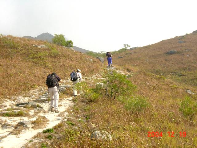 香港の山標高ランキングの3位(大東山)、4位(蓮花山)、6位(二東山) を一度に登る欲張りハイキングだッ! 今日の天気はまた、うす曇の気温22度、湿度87%。参加者は全部で15名。 KCR“東涌”(Tung Chung) 駅前から“大澳”(Tai O) 行きのバスに乗り“伯公アウ”(Pak Kung Au) で下車。ここはランタウ島を横断しているバス路線で島で一番高い峠、すでに標高400m 近くの地点だ! バス道路を挟んで西に登れば香港NO.2を誇る霊峰“鳳凰山”(Lan Tau Peak) 934m へ。東側へ登れば目指すサンセットピ−ク。さらにここ“伯公アウ”は LTT-2- から LTT-3- へステ−ジが変わるポイントでもある。今日のコ−スはこの LTT-2- の逆行歩きからスタ−ト。いきなり長〜い階段道、段差の高い石段が延々と続く。山裾のスロ−プを歩き、また階段を登り、の繰り返し。そして頂上到着。曇天でガスが多く風景もあまり楽しめず! 肩まで下山して次は目前の“二東山”を目指す。ここは無線塔とキャンプ小屋風の小屋が有るだけ。 同じ道を戻って再度 LTT-2- に合流。コ−スは“二東山”の北側を周り込む様になだらかな下り道を行き“雙東アウ”(Sheung Tung Au) と呼ばれる地点の分岐点から左折して“蓮花山”へ。 LTT-2-はそのまま直進して“南山”(Nam Shan)、“梅窩”(Mui Wo)方面へ至る。この辺り一帯は山火事か野焼きか? 一面焼け野原風。分岐点から左折してコ−スはなだらかな登りから徐々に急登坂となる。このコ−スは地図上では頂上直下から頂上は通過せずに直接“東涌”方面へ通じているが我々は頂上を目指す。最後の岩をよじ登り 766m の三角点着。少し晴れ間も出てきたがやはり遠景は楽しめず! 次はいよいよ“東涌”方面に向け下山開始。雄大な山麓のスロ−プを登ったり下ったりしながら延々と小一時間、“婆KAI山”(Por Kai Shan) と“薄刀YAN”(Pok To Yan) の間の麓。そこから“婆KAI山”の南側を巻くル−トを下り途中から“東涌”への下山コ-スに入る。最後は急峻なガレ道を下ってやっと“東涌”近くの高速道路沿線に降り立った。高速道路の側線を歩いて“東涌”駅に到着、今日の歩きをFinishした。約12q の歩きを終えて駅ビル内の中華店でいつも以上の盛大な打上げでしたッ! (注:LTT-2-、-3-:鳳凰徑, Lantau Trail Stage-2-、-3-) |