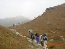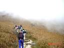 ↓“伯公アウ”バス道路脇のLTT標識前にて記念写真【写真No.01】、【02】。東側の階段を登りだす。直ぐに“南山、大東山”の標識前から雑木林の中の石段登りスタ−ト、しかし皆石段を避けて脇を登っている【04】。一しきり登ってふと振り向けば目前、ガスの中に聳え立つ霊峰“鳳凰山”ランタウピ−クの威容!【06】。ガレ道と石段登りが続く、、、 ↓しばらくガレ道登りが続いたら前方に大岩の散在、、、早くも先頭部隊はその岩の上で手を振っている。ここまで登って来て一同小休止【09】。さらに登り坂は続く、、、石段を登るにつれ噴出す汗! コブを迂回し、最初のピ−クに差し掛かってきた【12】 ↓最初のピ−クを過ぎて次のピ−クへ【15】、ここで再度小休止。これまでが急坂登りだったが、この後ル−トはいよいよサンセットピ−クの頂上南側を迂回するような山裾のなだらか登り坂となる。しかしこの辺りまで高度が上がるとガスが立ちこめてきた【17】。長い裾野が終わってやっと肩下へ【18】、ここでLTT-2-から外れて左手のピ−クを目指す【20】、肩まで登ったら頂上は目前、先頭部隊は早くも三角点の上【21】 ↓間もなく全員到着、“大東山”サンセットピ−ク 869m 頂上にて記念写真!【24】 ここで三々五々と大休止! 残念ながら立ち込めるガスで遠景の見通しが悪い。娘三人?【26】、青年二人?【27】、そしてオジサンを先頭に下山開始【28】 ↓この一帯は夏までは緑の大草原が広がる風景ながら既に12月、さすがに草は枯れ、ガスの中に一面茶色の風景が広がる。先ほどの肩下まで戻り再度LTT-2-に復帰【31】。大岩が大好き先発隊長とJapan-OG【32】。なだらか坂道を下った所の分岐点【33】、左手がLTT-2-“南山”方面だが我々は直進して前方の“二東山”を目指す、、、キャンプ小屋が散在する高原の歩きが続く、、、 ↓間もなく“二東山”に到着748m【37】。今下って来たサンセットピ−クの雄大な山麓【38】、無線塔とキャンプ小屋が有るだけの殺風景な山頂で記念写真【39】。元来た道を迂回しながら先ほどの標識点まで戻り、またLTT-2-に合流【41】。今度は“二東山”の北側を周り込むル−トでなだらか下り坂が続く【42】 ↓前方ガスに浮かぶ今日三番目の目標“蓮花山”【43】、LTT-2-のなだらか下り坂が続き徐々に近づく“蓮花山”の雄姿!【45】。この辺り一帯、山の斜面は何故か焼けている、山火事か?野焼きか? ある程度下ってきたら“雙東アウ”と呼ばれる地点の分岐点、LTT-2-はそのまま直進して標識にある“南山”方面へ【47】、我々はここから左折して“蓮花山”へのル−トを取る。香港の山の標識は何故か不親切、この標識に“蓮花山”への表示も付ければ良いものをッ! 山裾のなだらか登りからル−トは徐々に急勾配のガレ道登りとなって、、、 ↓岩の間の急坂登りにヒィ−ヒィ−ゼイィゼィ! やっと肩付近まで到着。先発隊長は早くも頭上三角点の岩の上【51】、【52】。そして、、、遂に全員到着“蓮花山”766m 頂上! 午前中より幾分ガスは減ってはきたが相変わらず遠景はダメ! 東側“梅窩”の街も湾もガスで薄ボンヤリ【53】、西側に目を転ずればこれまたガスの中、先ほど登って来たサンセットピ−ク(右)と“二東山”(左)【54】。狭い頂上三角点、ここでも記念写真【55】、そして今度は北側に向かって下山開始、いきなり腰高ほどもある草の中の獣道歩きからスタ−ト【56】 ↓道なき道の雑草掻き分け歩きを抜け出すと、前方小山の左手を走るル−ト【57】、あれが正しいル−トだッ! 雄大な山裾の歩き、、、後ろには今降りて来た“蓮花山”【59】、こうして見るとなかなかカッコよろしい! この辺りはランタウ島のど真ん中、小さなアップダウンを繰り返しながら道は続く、、、途中小休止を挟んで、、、やがて前方にモッコリ小山、あれは“婆KAI山”だ!【63】 ↓広大な丘陵地帯スロ−プの歩きが続く、、、標識は一切なし、前回の記憶を頼りに【65】の谷部辺りからル−トを左側にとって進む、、、15名の隊列が延び切ってしまった! やがて見覚えのある“婆KAI山”と“薄刀YAN”の間の麓【66】、あの裾で先頭部隊を止めなくては! 急ぎ足になる、、、“婆KAI山”を正面に見た地点【68】、そこから右手下に見えた空港高速道路【69】、その麓で待機していた先頭部隊【70】 ↓後続部隊を待ってる合間に“婆KAI山”482m 頂上を極めて下山する先発隊長、マッタク疲れを知らない男だッ!【71】、、、やがて全員揃ったところで今度は“婆KAI山”の南側から西側を巻くように【72】の左側“婆KAI山”、右側“薄刀YAN”の間のル−トを行く。やがて左手下方、ガスの中に“東涌”の街並み【73】。ル−ト途中から左折して“東涌”への下山コ−スに入る【74】、、、急な坂道下り、、、 ↓さらに途中から急峻なガレ道下りとなり、、、恐る恐る下山する一同、、、みるみる高度が下がって、、、近づく“東涌”の高層ビル群、、、そしてやっと麓まで下ってきた【84】 ↓この後、引水道脇の階段を下る【85】、