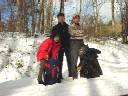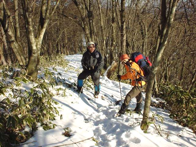 | 写真左から【22】霧氷が着いた木々の脇が榛名山の連山。奥に赤城山が見え、その左の雪山は袈裟丸山か、皇海山か、【23】浅間隠山をバックにコーヒーを入れる女史、【24】鼻曲山の頂上、【25】急坂を滑って下りる?、【26】思わずホッ!、【27】日陰と日向ではこんなに違います、【28】いつも絵になる二人 |