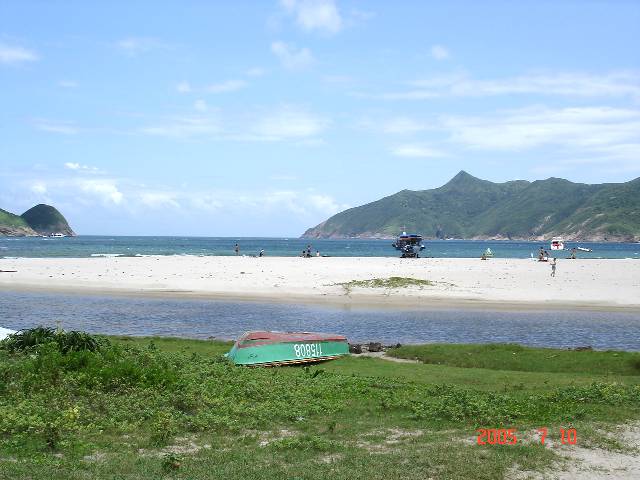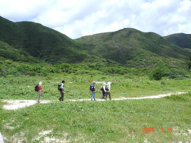 やっと“西貢”に到着したら、再度今度は緑色タクシ−に乗り換えて“西灣亭”(Sai Wan Ting) [別名:吹風アウ] へ向かう。“西灣亭”は“吹筒アウ”(Chui Tung Au) を経由してMHT-2-に至る主要ポイント。タクシ−はここの東屋前が終点、先ずは右手に“萬宜水庫”(High Island Reservoir)を眺めながらの下り坂、そしてちょっと登ると“浪茄灣”(Long Ke Wan)から始まるMHT-2-の途中、“吹筒アウ”(Chui Tung Au)の三叉路に到着。既に全身汗ビッショリ! 再度下って辿り着いた海岸が“西灣”。砂浜から入り江の奥の石橋を渡っると、今度は峠までの登り坂が続く。峠に着くとこのコ−スで最大の見せ場、絶景のポイント! 前方の“シャ−プ・ピ−クとその右手下に真っ白な砂浜が広がる“咸田灣”! 海岸の先に突き出た“望魚角”(Mong Yue Kok)とその先の“大灣”(Tai Wan)。猛暑だが夏らしい青空と緑が映える山、紺碧の“大浪灣”(Tai Long Wan)! 山の中腹を下って“咸田灣”のビ−チ傍の茶屋でしばしのリゾ−ト気分。そこから今度は“大浪凹”(Tai Long Au)までの長〜い登り坂が続く。“大浪凹”から“赤徑”までは過去何度も歩いた下り道。坂道を下った所で我々は二つのグル-プに別れる事にした。一組の5人は“沙頭”(Sha Tau)からボ-トで“黄石”(Wong Shek)まで。残ったもう一組4人はさらにMHT-2-を歩いて終着点の“北潭凹”(Pak Tam Au)まで。それぞれ後はバスやらタクシ−で“西貢”まで。ボ−ト組の5人は“黄石”のバス停でちょうど居合せたタクシ−に乗って一足早く“西貢”に到着、間もなく後の4人が乗ったバスも到着して合流。MHT−2−を完走した4人は約10q、ボ−トで“黄石”に渡った5人は約7q強の歩きでした。最後は“西貢”のイタリアン・レストランにて打ち上げ! (注:MHT-2-:Maclehose Trail (麥理浩徑) Stage-2-) |