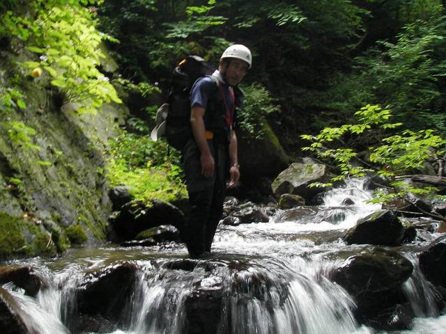 | 水量が多く、簡単に登れる数多くの小滝、ナメ滝、スラブ、そして数段で50mはあると思われる大滝のある沢。夏向きです。しかもツメの手前で登山道とクロスしており、難なく下山できます。いつもながら満足度高し。もっともっと有名でもいいような気がしますが・・・。 |