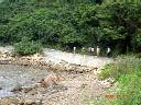 ↓“石壁水塘”を渡り切った所、LTT-8-の終点が今日の出発点【写真No.01、02】。過去何回も歩いた木陰の舗装路を行く。しばらく行くと二手に別れ道【03】、左手は“大浪灣”(Tai Long Wan)へ、我々は右手の坂を登る。下り坂から右側の引水道沿いに歩くと、間もなく休憩地点到着。ここの標識から右手の山道を登ると“龍仔”(Lung Tsai)、“萬丈布”(Man Cheung Po) 方面へ至る【06】。我々はそのまま直行! カマキリのお出迎え! ↓左手、時々木々の間に見える“大浪灣”【08】、“鳳凰山”ランタウ・ピ−クをバックに写真一発【09】、、、次の休憩ポイントで小休止【10】、この辺りから左手に下ると“大浪灣”キャンプ地へ至る、、、左下の岬は“白角”(Pak Kok)【12】、、、さらに引水道沿いの舗装路は延々と続く、、、真夏直射日光下だったらウンザリするこのLTT−8−! やっと“狗嶺涌”キャンプ場の標識が現れた【14】。間もなくLTT-8-、5.5Kmも終わりだ! ↓右手に見覚えの有る標識案内板【15】、三年前2002年8月18日にここでこんな⇒表示を見てLTT-7-行きを諦めたのだったッ! この横の階段を登ると“羌山郊遊徑”(Keung Shan Country Trail)から“分水アウ”(Fan Shui Au)を経由して“霊會山”(Ling Wui Shan)方面へ至る。そのまま舗装路を行くと直ぐにLTT-8-の始点、即ちLTT-7-の終点“狗嶺涌”の標識へ到着【16】。トレ−ル・コ−スは右手、標識【17】の“分流”の方に進むが、我々はここでトレ−ルを外れて左側の石段の坂道を下りだす。坂道途中、右手に見えた“深坑瀝” (Sham Hang Lek)430mの雄姿【18】と、前方には“分流東灣”を挟んで遥か彼方に香港最西端“分流角”(Fan Lau Kok)の岬【20】 ↓石段を下り切ったら林の先に“狗嶺涌”の海岸キャンプ場が見える。海岸沿いに道はなし、その手前のBBQサイトの様な所を行って、この標識“分流”【23】に沿って今度は階段を登り出す。峠の上まで登り着いて小休止【26】、ここまで登って思い出したッ! たしか以前“深坑瀝”から下って来て、ここから【27】先ほどの海岸まで下ったのだった。 ↓この峠から左、しばらく左手に海を眺めながら山中腹の歩きが続く。曇り空の向こうの島影は“索罟群島”(Soko Islands)【29】、、、真下には先ほどの“狗嶺涌”の海岸【31】、、、途中から手摺のついた細道の歩き、、、やがて前方に見えてきた“分流東灣”【34】、、、間もなく標識点着【35】。そこにコ−ス途中が崩れて通行止めの注意書き! どっちみち我々はLTT-7-、トレ−ル・コ−スを外れて海岸に下る予定だったので問題なし! ↓ここから左折の下りが“分流古堡”【36】、つまり大昔の砦の跡へのル−ト! 山裾を下って“分流東灣”の海岸に降り立つ【38】、赤みが混じった珍しい岩【39】、、、砂浜の先から右手に入ると再度“分流古堡”の標識【41】、、、そこの石段を登る。 ↓登り階段が続いて、、、やがて高台の不思議な形をした大岩に辿り着いた【45】、この辺りが香港最西端の岬、“分流角”のすぐ手前、多分“分流砲台”の近くだろう? 涼しい潮風と素晴らしい南シナ海の大海原を眺めながら、ここでお昼弁当を広げる事にした。今日は長距離長時間歩行なので各自前もって弁当を持参!【46、47、48】、、、30分ほど休んで大岩の傍で記念写真二発! ↓その後、大岩の横の小道を進むと有りましたッ! “分流砲台”の史跡【51、52】、しかし大砲の残骸ぐらい残っているか? と思ったが影も形も何もなし! 石垣の砦が残ってるだけだった【52】。その先にはこんな大きな史跡案内標示板【53】、、、右手の“分流頂”(Fan Lan Teng)【54】を見ながらしばらく山麓の歩き、、、 ↓やがてル−トが下り坂に差し掛かり、その途中左手に「石?環」と字が消えかかった古ぼけた標識が有ったが、これが“石圓環”(Stone Circle) と呼ばれる珍しい大石の円形敷石が有る“分流角”への道だろう? と思ったが、“分流砲台”と同じく、どうせまた大した事はないだろう!と、そのまま通過! その直ぐ左下に“天后廟”(Tin Hau Temple)【57】、、、ル−トは下って又もや海岸“分流西灣”だッ【58】! 砂浜の途中、真ん中辺りから右手に入って“分流村”の寂れた寒村に到着【59】。ここで再びLTT-7-に合流する事になる。次の目標は“煎魚灣”【60】。海沿いの道から登り階段【61】、、、“煎魚灣”キャンプ場の看板【62】を過ぎて、、、LTT-7-は続く、、、間もなく“煎魚灣”【63】 ↓海岸に近い山道の歩きから、ちょっと内陸部に入り、“標距柱”(Distance Post)と呼ばれるトレ−ル・コ−スには必ず起点から500メートル毎に設置された標識、地図上の"L065"辺り。鬱蒼と樹木が茂る人里から完全に遠ざかった古道の登り坂が延々と続く、、、堪らず途中小休止、、、時々視界が開け、、、左手前方の岩山【65】は?、、、ここまで来て初めて現れた“大澳”の標識【67】、あと5.5q、1時間15分とある。又もや薄暗い森の中、気持ちの悪い廃家【69】、、、湿地帯を通り抜け、、、 ↓そしてやっと“二澳”の海岸に到着【71】。“二澳新村”(Yi O San Ysuen)と