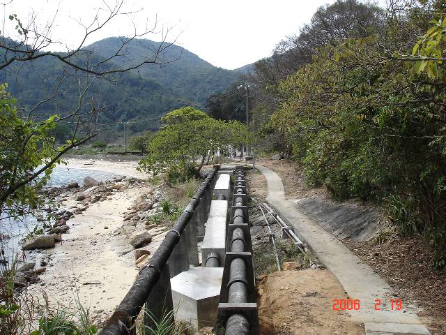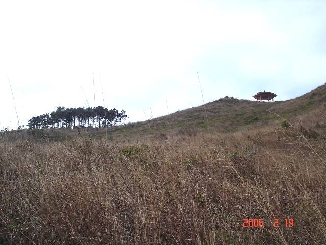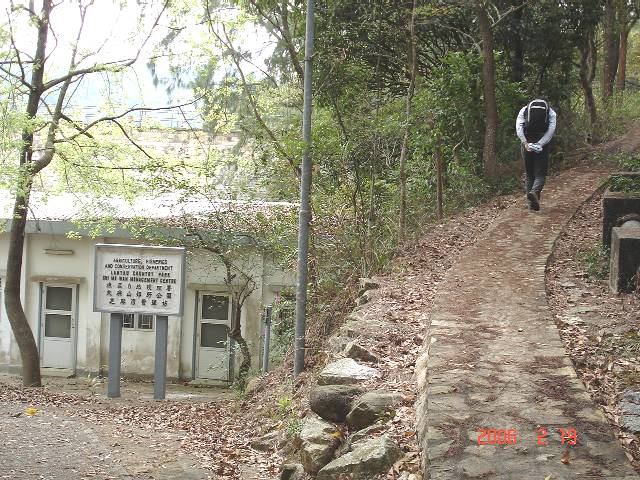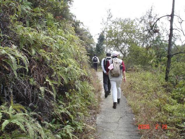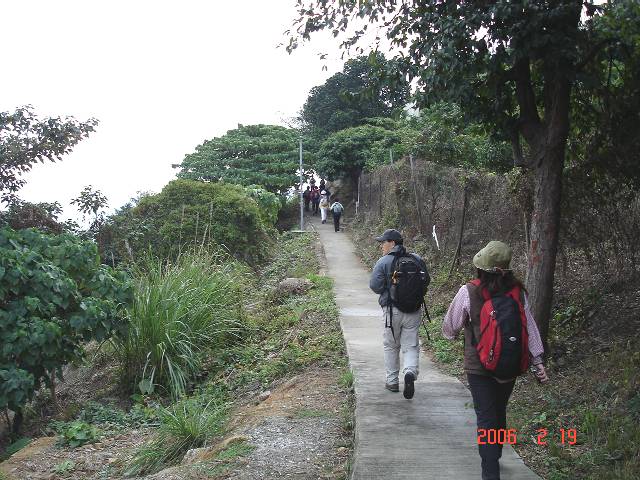 ↓“梅窩”のフェリ−埠頭横で出発前の記念写真【写真No.01】。埠頭から左手の海岸線を廻り込んだら直ぐ右手にLTT-12-終点で“貝澳”方面へ至る標識【02】。ここがスタ−ト地点だ! 階段を登ると左手の海を眺めながら丘の上、、、曲りくねった海岸沿い丘陵の歩き、、、コ−スは徐々に登り坂、おッ、あんな所に去年までは無かった東屋が【06】! その左手の峠を目指して【07】 ↓間もなく小高い峠に到着【08】。LTT-12-はここから右、西側方面だが一休みして我々はトレ−ルコ−スを外れて直進【09】、引き続き海岸沿いの丘陵地帯を行く、、、林の中を抜けて、、、途中"姉弟"久しぶりのツ−ショット【11】、、、しばらく行くと道は“水井灣”(Shui Tseng Wan)の海岸まで下る【12】。海岸散策の後、遠方に“芝麻灣”が見えはじめ、、、再度丘の上の歩き、、、コ−スは狭い舗装路に変わって、、、これ何ッ?【14】そのゴム切れが付いた棒は山火事を消す叩き棒だよ! ↓青々とした“芝麻灣”【15】を左手に眺めながら道は続く、、、コ−ス脇の休憩東屋をそのまま通過、、、再び海岸線近く、“横塘”(Wang Tong)の村落を通過【19】、、、対岸に“拾望新村”が見えてきた【20】その向こうの山がたしか“老人山”Uピ−クだッ! ↓“拾望新村”の村役場?前広場に到着して小休止【22】、傍にはドラゴンボ−ト【23】と痩せこけた水牛【24】。ここはちょうど“芝麻灣半島”の付け根クビレ部分だ。休憩の後、畑脇の車道になった舗装路を行く、、、“拾望涌口”(Shap Long Chung Hau) へ至る【26】右側車道の登り坂、、、そして道幅が広くなり下り坂となって、、、 ↓左手下方、鉄条網に囲まれた大きな建物は“芝麻灣懲教所【29】。ニコチン中毒の“光頭老”もいずれここに世話になるかも? とか考えながら施設の右脇を下って【31】、、、海岸傍に出た。海岸線を過ぎたら再度林の中の舗装路登り【34】、大きくカ−ブした坂道を登った所にある緑の円形建物、立派なベンチに座って小休止【35】 ↓しばしの休憩の後、左手標識脇からなだらかな山道登り【36、37】。管理事務所の右側の坂【38】を登ると直ぐに貯水ダムに出た【39】、今日は満々と水を湛えたダム堤防を渡る【41】。渡り終えた階段の上、“龍尾”まで1.5qの標識【42】 ↓この標識に沿って行くと、静かな林道の登り道が曲りくねりながら続いている。途中の三叉路【44】からまた右側“龍尾”に向かって進む、、、間もなく 登り着いた峠の上、“芝麻灣”半島のほぼ中央、“龍尾”に到着!【47】。“龍の尾っぽ”のつもりか? アホみたいな、子供だましの様なオブジェを囲んで記念撮影【47】。ここから左手南側下りは“大浪灣”へ、直進は以前行った“ニ浪灣”へ至る。今日の我々は右手西側の階段【48】を登って“老人山”へ向かって登り出す! ここの標識には『拾望 経 老人山 4q、1-1/4hr』、つまり日本語風に解釈すると"拾望 経由老人山まで"、と理解するが、実はその逆で"老人山経由拾望まで"と解釈するのが正しい。この様に香港の経由表示は日本と逆なので要注意! ↓階段を一しきり登ったら平道、木陰の間に見えてきた“老人山”【51】、また苦しい階段登りが続く、、、竹林道を抜けて、、、階段途中で木に寄っかかって呼吸を整える我が"連れ合い"【53】、そう云うこちらもヒィ−ヒィ−ゼィゼィ! 一旦谷部への下り【54】、ここから再度階段登りが続き、、、 ↓やがて山火事監視の建物が見えて来た【57】、ついに“老人山”頂上303mに到達! 右手下には先ほどの貯水ダムと北方の彼方、左側に今まで歩いて来た海岸線【58】。小屋の周囲で大休止! ここの三角点はこの小屋の屋上に有った!? 南側の小島は“石鼓洲”(Shek Kwu Chau)【60】、そして写真には撮らなかったが東には“長洲島”(Cheung Chau) も見える。記念写真を撮って早々に次の無名の“Uピ−ク”【62】を目指して今度は北側に向かって下山開始。 ↓下り階段途中から微かに見えた“Uピ−ク”への急階段【65】、ズ−ムアップすると三代目先発隊長が一人、独走中【66】。100m程も下りきって今度は又もや再登坂【67】、登り階段途中から振り返れば先ほどの“老人山”【68】、、、まだ続く階段、フッ−! そして頂上付近【69】! やっと302mの“Uピ−ク”に到達! 眼下の“貝澳灣”が素晴らしいッ!【70】 ↓うす曇の天気だが視界は良好、左手西側には“長沙”(Cheung Sha) 方面の海岸線とその向こうにはガスに霞む霊峰“鳳凰山”(Lantau Peak) の勇姿【71】。眼下の“貝澳灣”を見下ろす断崖の渕で、Japan-OB/OG会々長の"T.Ukai"氏を囲んで想い想いのツ−ショット! 北東方面には歩いて来た“拾望新村”付近と“芝麻灣”の海【76】。全員で記念写真一発! ↓写真を撮り終えたら北側の“芝麻灣道”を目指して下山開始【78】、岩場を出たら長〜い階段下りが続く、、、松ポックリの林を抜け、、、又もや階段を下ってやっと下りも終わった! そこに有った標識【84】 ↓ここは“芝麻灣郊遊徑”(Chi Ma Wan Country Trail) の入り口ゲ−ト【85】、そして