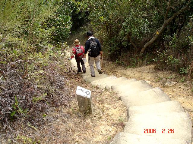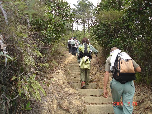 先ずは舗装路を歩いて“城門水塘”(Shing Mun Reservoir)”入口まで、その後しばらくダムの南側を歩いて堤防を渡り切った所からMHT-7-“針山”のスタ−ト地点。トレ−ルコ−スはここから恐怖の階段登りが数百段! 階段登りをクリアし、一旦平地から二つ目の峠まで再度の階段を登リ切ったら目前に“針山”の三角形の威容が目前に飛込む。急傾斜の直登階段とガレ道を必死に登ってやっと頂上へ。今日は曇天だが比較的遠景の視界もきく。 今度は反対側に同じく急斜面の階段ガレ道を下って舗装道路へ出る。そこからMHT-7-は山並みに沿った緩やかな登りが終わって林の中、“草山”や“鉛礦凹”(Lead Mine Pass)方面と“沙田”(Sha Tin)方面への分岐点に到着。その頃天候は回復し気温も急上昇! ここから“草山”までは延々と舗装道路の連続! 今日の参加者の内、数名の方は“草山”を知らないが、他の仲間は既に“草山”登山は経験済み。暑さと舗装道路の歩きに嫌気がさして、結局この分岐点から“沙田”方面へ下ることにした。このル−トは光頭老と"連れ合い"以外の仲間は全員初めて! しばらく林の中の小道を行くと、今度は“火炭”(Fo Tan) 方面との分岐店。そこを右折すると、今度は急坂下り。草木が生茂る山道は地割れした赤土ガレ道の下りが続く。木立の中の歩き難い赤土の抉れた溝状の道を延々と下って行ったら最後は“道風山路”(To Fung Shan Rd,)の車道へ出た。 “なんとか神学院”?と表示の有るカトリック系でもなさそうな謎の白亜の建物横を下って行き、“百樂徑”(Pak Lok Path) との三叉路で今日の約7q程の歩きを終えた。タクシ−を拾ってKCR“沙田”駅前の“排頭ビレッジ”まで。駅ビルショッピング・モ−ル内のレストランは何処もイッパイ! 結局この日は残念ながら最後の〆の打上げも止めてここで解散! (注:MHT-6-,-7-:Maclehose Trail(麥理浩徑) Stage-6-,-7-) (注:WST-7-:Wilson Trail(衛奕信徑)Stage-7-) |