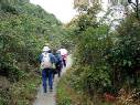 ↓タクシ−終点“西灣亭”で出発前の記念写真【写真No.01】、ここはMHT-2-に至る主要ポイントなのでいつもは大勢のハイカ−が居るが、今日の小雨模様曇天ではさすがにまばら! 東屋手前にある“鹿湖郊遊徑”の標識【02】から階段を登り始める一同。すぐに視界が開け右手、ガスの彼方に“シャ−プピ−ク”が見えるはずだがこの天気では?【05】。しばらく行くと鹿の標識【06】に添って左折、赤土の泥んこガレ道を行く、、、 ↓曇天ではあるが比較的空気は澄んでるようで“大浪灣”(Tai Long Wan) の“夫婦島”も見える【08】。間もなく前方雲に隠れた目指す“牌額山”!【09】 ここから見るとなかなか立派な山姿だ、、、ガレ道は下り坂となり右手下方に小さな貯水池【10】。泥んこ道を滑らないように下って、、、降り立った所が大きな沢【13】、地図上ではこの辺りが“鹿湖”。沢を渡って階段を上がる、、、 ↓今度は林道に出る【15】。途中の鹿の標識どおりに進むと、、、林を抜けて再度丘陵地帯の荒れたドロ道を登って行く【16、17】。やがて左手山のこれから登らなければならない階段を睨みながら【18】、コ−スは一旦下って三叉路に立つ標識点へ【19】。右手に行くと以前ここから“大蚊山”(Tai Mun Shan)へ行った“赤徑”方面、直進が“鹿湖郊遊徑”の階段登り。ドロだらけのこの靴を見よッ!【20】。靴底に泥がへばり付いて重いッ! ↓この階段がきつい!【22】、以前の記憶が甦る。途中たまらず足を止めて振り返ると今歩いきた道と遥か彼方の山は“西灣山”(Sai Wan Shan)か?【23】、その左手には先ほどの標識から“大蚊山”へ向かうル−ト【24】、、、やっとこさ階段も終わり峠の上に立つ。北側遥か彼方には“赤徑”の湾も見える【25】。東側の空、低い雲が垂れ込めているが遠くには薄っすらと青空も【27】。しばし小休止の後、しばらく平道を行くと、、、 ↓この辺りますます泥んこ道【29】、そして数十段の階段を登った所から直進が引き続き“鹿湖郊遊徑”だが直ぐ右手にガレ道の小徑!【31】、ここが“牌額山”への登り口だ。標識もなくウッカリすると見逃すような草の踏み跡から右手の潅木の中に入り込んだら意外とハッキリしているル−ト。そのまま真っ直ぐ登って行く、、、途中から大きく左に曲がりながら道は続く【34】、、、ますます生い茂る潅木の中を分け入って、、、 ↓間もなく、目前のガスの中に迫る“牌額山”【36】。早くも頂上付近に立つ先発隊長【37】。いよいよピ−クを目指してガレ道を登り出す【38】、、、直ぐに頂上手前まで至った【39】。北側下、雲間に広がる“赤徑”の海【40】が素晴らしい、、、頂上は笹薮!、、、北東側の“シャ−プピ−ク”は完全に雲の中【42】 ↓“赤徑”の海の先に広がる“大灘海峡”(Tai Tan Hoi Hap)【43】。“牌額山”400m頂上には三角点はなかった。低く垂れ込めた雲とガスっぽい天気だが予想以上に素晴らしい眺め! 記念写真を撮ったら西側に向かう尾根を下り始める【45】、かなりの急坂! 左手遥か下の谷を走る道が“鹿湖郊遊徑”【46】。急坂下りが終わったら尾根伝いにそのまま前進、、、右手前方に広がる雄大な山並み【48】、これからあの尾根を行くのだ! 間もなく前方に小高いピ−ク【49】。 ↓“牌額山”の尾根に連なる最後のコブ山【50】、この頂から左手南側に下ると“鹿湖郊遊徑”に合流して“大枕蓋”へのル−トに繋がる。この付近から眺めた“赤徑”と“大灘海峡”も実に素晴らしい【51】、この景観をバックにJapan-OGは一人で【52】、そして仲間達と記念写真一発!【53】。このコブ山頂上から眺めた南側の雲に隠れた山が“大枕蓋”【54】、そして東側には今降りて来た“牌額山”【56】 ↓これから先は北側の“北潭凹”までの尾根道! 小さなコブを登ったり下ったり三度、四度、、両側に広がる高原の眺めを満喫、幸い小雨も降らず涼風に身体を委ねながらの下山が続く。但し所々足元の赤土泥濘には参った!、、、正面にはMHT-3-最初の山“牛耳石山”(Ngau Yee Shek Shan)【60】、右手東側に迫る筈の“シャ−プピ−ク”の威容は残念ながら雲の中!【62】、西側遠方は“西貢”の海【63】 ↓尾根高原のアップダウンが続く、、、正面の小高いピ−ク、あれが最後のピ−クだ!【65、66】、、、泥濘道の下りは滑りやすく、皆二度、三度とズッコケ! 靴とズボンを汚しながらの奮闘が続く、、、最後のピ−クを登る途中、“シャ−プピ−ク”をバックに撮ってるつもり?【68】、もし好天なら⇒こんな背景です。 ↓実はもう一つ小さなコブが有った【72】、、、ここまでの尾根歩きは以前何回も歩いた“大枕蓋”への逆行コ−スだが、その途中が左手下を走る山麓ル−トだったのでこれほどの雄大な感じはしないが、今日のこの尾根下りは実に素晴らしい! 最後の泥んこ道を用心しながら下る一行【73、74】。右手直下に“土爪坪”の海が迫った頃【75】、高原尾根歩きも終り、潅木の中のこれまたドロドロ赤土の下り【76】、誰かがズッコケたッ!、、、やっと