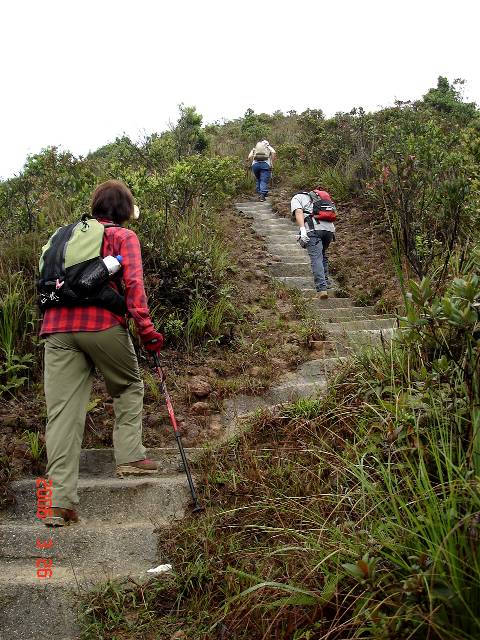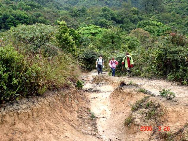 MTR“鑽石山”(Diamond Hill)駅構内にあるバスタ−ミナルからバス96R“黄石”(Wong Shek)行きに乗ったら、いつもの大勢の客も今日はまばら! やっぱりこの悪天候だからな〜、と納得。“西貢”(Sai Kung) で下車して今度はタクシ−2台に分乗、“西灣亭(吹風アウ)”(Sai Wan Ting)へ向かう。“西灣亭”は“吹筒アウ”(Chui Tung Au)を経由してMHT-2-に至るお馴染み主要ポイント。タクシ−はここの東屋前が終点、その東屋のちょっと手前にある“鹿湖郊遊徑”標識からスタ−ト。階段を登ってしばらく丘陵地帯を歩いてル−トは次第に大きな沢まで下る。この間、ここ数日の雨模様で赤土の道はドロドロのぬかるみ状態! この大きな沢が地図上の“鹿湖”、鹿の姿は見えないけど? そこから階段の上、林を抜けたら再度丘陵地帯に出て、しばらくダラダラ坂を登ると三叉路に出る。右手に行くと“赤徑”(Chek Keng)方面へ至る。“鹿湖郊遊徑”はそのまま直進の階段登りと続く。かなりの急階段が続きやつと峠の上に辿り着く。ここからしばらく平坦な道のあと再度階段を少し上がった所、直ぐその右側に標識はないが“牌額山”への登山口がある。若干のヤブ中歩きになるが、スム−スに頂上を目指すル−トが続く。肩下まで登ったら頂上までは一直線のガレ道。すぐに400mの頂上に立った。曇天ながら空気は比較的澄んでて、時折雲の切れ間から“赤徑”の海など想像した以上に素晴らしい景観が望めた! 下山は真下の“鹿湖郊遊徑”と平行して西側に向かう尾根を下り、南側の“鹿湖郊遊徑”に合流するもう一つのピ−クから進路を北にとり、“北潭凹”(Pak Tam Au)までの素晴らしい尾根道歩きとした。過去何回も“大枕蓋”へ向かって歩いたコ−スの逆行だ。小アップダウンの尾根道下り、靴もズボンも泥んこになりながら雄大な山並と“赤徑”や“土爪坪”(To Kwa Peng)の湾を見下ろしながら快適な歩きが続き、最後“北潭凹”のバス停前に到着。7q弱、3時間半のコンパクトな歩きながら変化も多く、幸い大雨にも遭わず曇天の景観も素晴らしいものでした。今日の締めは“西貢”で久しぶりにお馴染みMrs.Susannaのステ−キハウス。 (注:MHT-2-、-3-:Maclehose Trail (麥理浩徑) Stage-2-、-3-) |