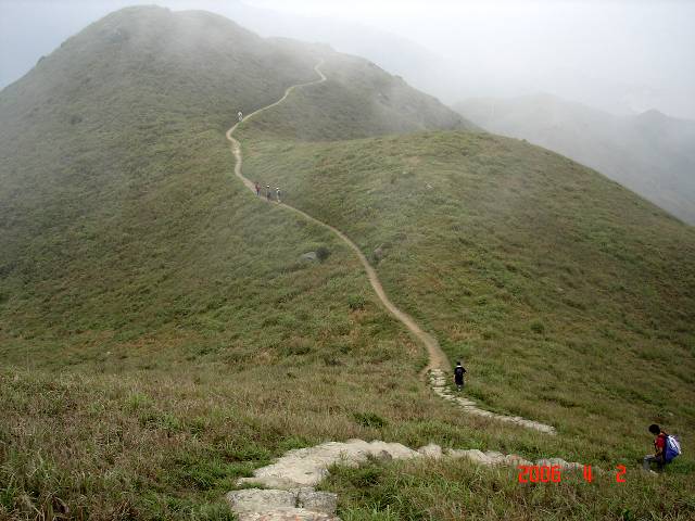 今回こそは晴天の日を狙おう、と3日前の天気予報で今日の天気を確認しての計画だったが“天は我に味方せず”、昨日午後から天気は急変! 曇り空の気温22−26度、湿度96%と蒸し暑い天気。もし雨にでもなったら途中で予定変更のつもりで“中環”(Central)から高速フェリ−で“梅窩”(Mui Wo)へ。30分弱で“梅窩”へ着いた後は波止場前のバスタ−ミナルから“昴坪”(Ngong Ping)行きのバスで約30分、“嶼南道”(South Lantau Rd.) の最後、“石壁水塘”(Shek Pik Reservoir)のダム堤防手前で下車。そこからバス通りをちょっと戻り、左手の“石壁郊遊地點”(Shek Pik Picnic Area)の公園に入る。 この公園が今日のスタ−ト地点だ。“石壁郊遊徑”(Shek Pik Country Trail)、別名“貝納奇小徑”に入る。林道の登り道を行くと急な階段登りが待っている。階段を上り切ったら平坦な森の中の小道を10分ほども歩くと右手の草むらに見覚えのある布切れの目印! 前回2004年3月はここで“狗牙嶺”に向かうパ−ティ−と、高所恐怖症?の残りのメンバ−はこの地点を直進して“天壇大佛”(Buddha Statue)が有る“昴坪”へ、と二手に別れたが今日の顔ぶれでは12名全員が“狗牙嶺”へ向かう勇気有る?メンバ−! 天気は曇り空だが雨は降りそうにない。よしッ! と意を決して“狗牙嶺”へのアタック開始! 先ずはヤブの中に分け入るが、直ぐに視界が開けて急坂のガレ道登りが始まる。かなり苦しい登りがしばらく続き最初のピ−ク“中狗牙嶺”と呼ばれる428mの三角点に到達。しかしここで心配していた雨がパラパラと! これ以上降らないことを祈りつつ出発。その後、高度が増すに連れガスも出てきた。 やがて険しい岩登りが待っていた。両手両足で這いつくばってやっと尾根に着いたと思ったら、又もや目前に迫る次の岩山! 前回程ではないがガスで下方の切り立った断崖絶壁もさほど高度感を感じない。 狭い尾根歩きのアップダウンの後、いよいよ“狗牙嶺”に差し掛かる。ただただ必死に岩に取り付くこと三回、やっと最後の岩を越えた後、大岩の後ろから谷の裂け目のような所を越えて稜線の上に出る。ここから左手が“西狗牙”と呼ばれるもう一本北側の“石壁郊遊徑”へ繋がるル−ト。今度は稜線から右手に向かって進むと又もや急激な岩登り、やっと最後の岩をクリアしたら間もなく見覚えのある赤い危険表示板、“ランタウ・ピ−ク”直下の標高800m、LTT-3-に合流! “閻王壁”と呼ばれる地点だ。これより後は“ランタウ・ピ−ク”までの石段登りが続く。“狗牙嶺”の岩登りで体力消耗した後の階段登りは苦しい! ついに“ランタウ・ピ−ク”頂上934mに到達! ここまで途中、雨は幸いパラパラ程度で済んだが濃いガスで折角の雄大な風景が望めないのが残念! 東側にそびえ立つ香港標高第三位の“大東山”(Sunset Peak) 869m が雲の切れ間に時々微かにその頂を覗かせるだけ。その“サンセット・ピ−ク”を正面に見ながら“伯公[土幻]”(Pak Kung Au)に向かって下山開始。長〜い石段階下りと草原の尾根歩き、そしてまた石段階下りと下山ル−トは続く。標高600mの東屋で一旦休憩、その後再度の階段下りを経て山裾のスロ−プを下って行き、最後の階段を下ってやっとこさ“伯公アウ”のバス道路に到着。約6時間、8q程の歩きをFinish! バスで“梅窩”まで移動、今日の打上げはイタリアンでした。 (注:LTT-3-:鳳凰徑 Lantau Trail Stage-3-) |