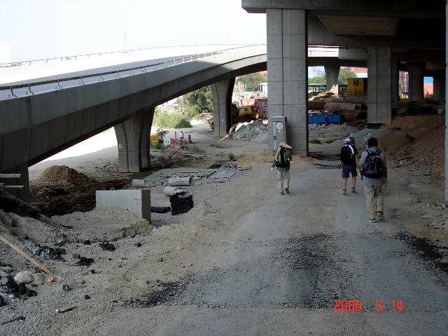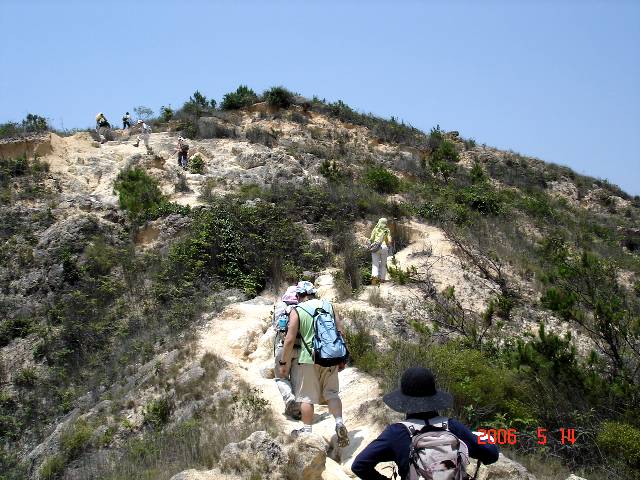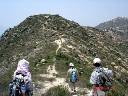 今朝のTV予報ではMax気温25度、湿度70%、で湿度が低い快適な晴れ! 集合場所のMTR“筌灣”(Tsuen Wan) に集まった仲間は久しぶりの古い仲間を加えて計16名の大部隊。“筌灣”駅に隣接するバス・タ−ミナルからダブルデッカ−(Bus60M)で“屯門”へ。そこからタクシ−四台に分乗してキャッスルピ−クからの下山道、“良景邨”(Leung King Est.) と云う団地へ向かう。団地正門でタクシ−を下車、そのまま団地内を直進して突き当りから右折、しばらく行くと キャッスルピ−クからの下山口へ至る。標識も何もない解り難い舗装坂道、そこが今日の登山口! そこを登り出すとかなりの距離の急坂が続いて汗ダクになりながら、やっとキャッスルピ−クからの下山ポイントまで辿り着く。ここからが本格的な“乾山”登山ル−トだッ! ガレ道を登って最初のピ−クへ、一旦平道となって尾根道へ、その後はガレ道と岩だらけの急な登坂が続く。岩山の上からその裏手を廻って目前の“乾山”を目指して登り394mの頂上へ。キャッスルピ−クからの展望と同じく、またその名のごとく“乾いた山”って感じの周囲一面ガレ山の珍しい光景! 北側への下りル−トもガレ道急坂下りが続く。かなり下ってやっと平らなル−トになるが相変わらずガレ道が続き、それから再度登り坂。ちょっと登って小さな尾根伝いに進んだ途中、前方の“圓頭山”が見え始めた地点で前回は右(東側) への下りル−トから下山したが今日はそのまま直進! それから後も乾き切った砂漠のような荒涼とした尾根道、数回のアップダウン行が続く、気温は28度と上がったが湿度が低く、なによりも涼しい風に救われてやっと“圓頭山”の一つ手前のピ−クまで辿り着いた。問題は“圓頭山”手前の谷、鞍部がどの程度深いか気になりながら更に前進! 手前のコブまで来てやっとその鞍部が見えた、、、幸い深くない。最後の登り“圓頭山”頂上375mを目指す! 頂上からの眺めはこれまた絶景! そして下山路は前回と同じくル−トがハッキリ見える北側の“元朗”(Yuen Long)方面を目指す。 小さなアップダウン繰り返しの長〜い下山ル−トが続いた最後、降り立った場所はどうやら“厦村”(Ha Tsuen)と呼ばれるコンテナタ-ミナルがある村落付近らしいが、前回は無かった建設中の“后海灣(Hau Hoi Wan)幹線道路”の工事現場、前回よりちょっと手前になるようだ。直線の舗装道路に出て長〜いテクテク歩き! やっと直線道路が終わった所が“田厦路”(Tin Ha Road)。そこからタクシ−に分乗して“元朗”まで。あんなにきつかった5時間強の歩きだった割には歩行距離は約10q! “元朗”では上海に転勤した旧仲間も駆けつけて盛大な打ち上げで終わりました。 |