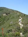 ↓“良景邨”の団地の奥、突き当たりから右手に周り、左手の舗装坂道で出発前の記念写真【写真No.01】。しかし目印になるものは皆無、唯一この写真の背景を参考に! 汗ダクになりながら坂道を登り出す。かなり登ったら左手上部に見えてきたキャッスルピ−クの突端【03】、、、やっと見覚えのあるキャッスルピ−クからの下山ポイント、小さな広場に着く【04】。小広場の先からいよいよ“乾山”登山ル−ト【05】、荒れたガレ道登り【06】、、、途中返り見た北側の山並み【07】 ↓ガレ道を登り切った最初の丘、そこから見た目指す“乾山”(写真左の山)【08】。先ずは写真右側の“乾山”手前のピ−クを目指してこれよりしばらく尾根伝いの道が続く、、、最初の鞍部への下り【11】、そしてガレ道登り【12】、、、岩と砂の荒れたガレ道登坂が続く【13、14】 ↓急坂登りに息切れして、時々足を止めて返り見ればキャッスルピ−クの威容、カッコいい〜!【15】と手前は先ほどの尾根道。やっと最初のピ−ク下まで登り着いて南側下を見れば“屯門”の街並み【16】とその向こうの“九徑山 (九峰峯)”、反対側の北側の山並み【17】、あの緑色の地帯は何だろう? ピ−ク下の岩場で小休止の後、ちょっと登ると左手に周り込んで中腹の歩き【19】、、、その先が“乾山”への最後のガレ道登り【20】、、、そして頂上394mに到着、キャッスルピ−クをバックに記念写真【21】 ↓周囲の光景はその名の如く乾いて荒涼とした山並み! まるで映画で観たアフガンの山岳地帯の様な乾燥した地肌の山並みが広がっている、、、遥か前方右手の山【22】が次なる目標の“圓頭山”! ここから今度は北側へ向かって急坂下りル−ト【23】、、、ガレ道下りは滑りやすくて危ない、、、下って、、、下って、、、やっと平地【27】、と思ったらまた登り、、、尾根道歩きが延々と続く、、、振り返ってみた今までの道のり【28】 ↓この丘【29】まで登ったらまた前方の視界が広がってきた。先ずは写真【30】手前のあのコブまで! しかしその手前に見える見覚えのあるチョット恐い箇所⇒ガレ道の両サイドが深く抉れて道幅が50p程の傾斜した砂道。そこを通り抜けてコブへ向かう【31】、前回はここから右手に降りて渓谷沿いに下山したが、今日はそのままコブ山まで登って小休止【32】、その前方右手が“圓頭山”。一旦下って再度の尾根道歩きが続く、先ずはあの“圓頭山”手前、左側のピ−クまで【34】、又もやガレ道登り、、、 ↓荒れた砂地のル−トから登り坂に差し掛かり、坂の途中から返り見た今まで歩いて来た尾根道ル−トと遠方のキャッスルピ−ク【38】。登り坂が続く、、、女性は日除けの頬かむり! 徐々に近づく“圓頭山”【41】、その右手下に広がる“屯門”北部の街並みと建設中の“后海灣幹線道路”【42】 ↓今や後ろの方に遠のいた“屯門”【43】、、、やっとこさ“圓頭山”手前のピ−クに登り着く【44、45】。しかし“圓頭山”までは未だかなりあるな〜【46】、あの手前の谷は深いのだろうか? 不安!(^_^)! 休んだ後、気を取り直して再出発。またまたガレ道急坂下り【47、48】から最後のコブを目指して【49】、、、あそこまで行かないと“圓頭山”手前の鞍部が見えない。 ↓近そうで、近くない、、、最後のコブへの登り【51】、そしてやっと見えました“圓頭山”手前の谷、鞍部はそれほど深くなかった【52】、ホッ! 安心! いよいよ今度こそ本当に最後の最後の登り、“圓頭山”へのアタック開始【53、54】。ヒィ−ヒィ−ハァ−ハァ−汗、汗、汗、、、そしてやっと着きました頂上375m! 北側の海は“后海灣”の架橋工事【55】、ほぼ完成しているようだ? その向こうは中国“珠江”方面だが、残念ながらカスミの中! その右手には“天水圍”(Tin Shui Wai)辺りの街並みと手前左手の鉄塔辺りが下山ル−ト【56】 ↓後ろ南側を振り向けば左端のキャッスルピ−ク【57】から“乾山”、そして今日歩いて来た尾根道がここまで延々と続いている、よく歩いたな〜! 東側下の街並みと“后海灣幹線道路”【58】。三角点を囲んで記念写真一発【59】。小休止の後、北側に向かって下山開始、ここも急坂で前回3年前は補助ロ−プが張ってたが今日はチェ−ンに変わっていた。チェ−ンを伝って順に下る【60、61】、、、全員無事に着地! しばらく尾根道を行って先ほど頂上から見えた鉄塔の方へ向かって下山路は続く【63】 ↓鉄塔脇からちょっと登るとまた尾根道【65】、道なりに進んだが途中でコ−スがあやふや? 3年前の記憶もあやふや? 写真【65】の左手から右側に迂回しながら下ったら草木が生えた尾根道へ出た【68】、、、そのまま道なりに歩き、平道からやがて下り道、、、3年前の記憶にない樹木の中の小道【70】(前回3年前のレポ−トを見たら、やはりこれほど草木は無かった、時期は4月と5月、あまり変わらないのに?) ↓しかし、左手に視界が広がるここまで来て記憶が甦った【71】。と、突然また見知らぬ風景【72】、正面の山が切り崩されて