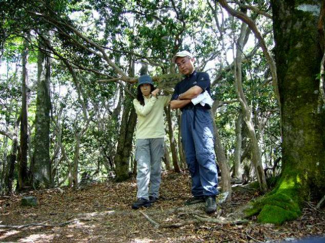 【23】地面近くに生えているのはアセビ(馬酔木)。鹿は嫌いなのでしょうか。 【24】ミツバツツジもなんとか食害を免れていました。 【25】八丁山到着。周りはアセビに囲まれていて眺望無し。 【26】とりあえず記念撮影。 【27】アブだかブヨがうるさく付きまとうのでタオルでガード。 【28】遠景は芋木ノドッケ。我々は「芋ノ木ドッケ」と呼んでました。 |
