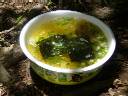 【09】ロープが頼り(やらせです)。 【10】もう浜立山と同じくらいになりました。 【11】浜立尾根と合流。左手にも踏み跡があります。 【12】ここで昼食。虫がブンブンうるさい。 【13】伊藤さんの昼食。「麺の達人」夏バージョン。 【14】上を見上げると青空も覗いていました。 |