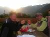 【37】祠のところが頂上です 【38】記念撮影 【39】残念ながら視界は不芳でした 【40】「さてこれからどうするか・・・」常念小屋にて 【41】テラスで乾杯 【42】夕日と槍ヶ岳 |