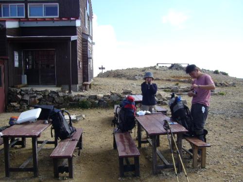 【65】大天井小屋 【66】大天井の頂上。バックは穂高 【67】同じくバックは槍 【68】当然記念撮影 【69】頂上から下山して、そろそろ行きますか 【70】大天井からの下り |