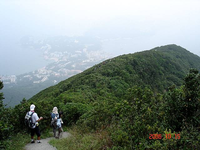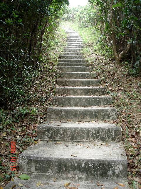 マンション裏手の階段が終わったら一旦平道に出て、次はガレ道の登り坂が続く。曲りくねった山道を登って行くと直ぐに“バイオレット・ヒル”の肩に到着。一旦コ−スから外れて右折、荒れたガレ道を下るとすぐ右側に頂上への階段。かなりの急階段を一気に登って436m の頂上に立つ。“紫羅蘭山”436m は香港島の中部より若干東南部の“大潭郊野公園”(Tai Tam Country Park) の中にある山。“バイオレット・ヒル”なんて洒落た英語名が付いてるが、何処が“バイオレット”なのか? 再度同じ道を先ほどの肩まで戻り、WSTコ−スに沿って二番目のピ−ク 433m を通り過ぎたら今度は稜線に沿った山並みのなだらかコ−スが続く。遠方に見えてきた“赤柱”(Stanley) 方面の美しい海は今日の濃いガスではサッパリ! 一方目前に近づく“双崗山”の頂上までガスの中にぼんやり一直線に延びる階段を見てため息! 山腹沿いに“浅水灣”(Repulse Bay) の海岸を見下ろしながら歩き、今度は“レパルス・ベイ”へ抜ける谷部までの長〜い階段下り。そこからがいよいよ“双崗山”(The Twins) まで"恐怖の1200段階段"、心臓破りの直登行。ヒィ−ヒィ−ゼィゼィ云いながらやっとこさ900段目程の“The Twins”の最初のピ−ク 363m着、小休止後さらに300段程登って最後の“双崗山”386m 頂上に立つ。そこからは直下に広がる“スタンレ−”の街と灣もガスでぼんやり! なだらかな下り道と最後のまたまた長〜い階段を下って“赤柱峡道”(Stanley Gap Rd.) のWST-1-のスタ−ト地点に到着。計4時間、約7km弱の内9割方は"階段"でした。フッ−! “赤柱峡道”からダブルデッカ−に乗って“スタンレ−”まで移動、今日は久しぶりにイタメシで最後の〆打上げ! (注:WST-1-:衛奕信徑, Wilson Trail Trail Stage-1-) |
