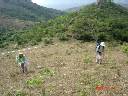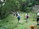 ↓タクシ−は“筌錦公路”を登って“筌錦アウ”まで。右手の“大帽山”(Tai Mo Shan) への入り口をチョット通り過ぎた辺り、左側のMHT-9-のスタ−ト地点でストップ、ここで記念写真【写真No.01】。これより鬱蒼たる森の中の舗装路、なだらかな登り坂道が続く、、、一しきり坂を登り切った所でMHTの標識【03】、生まれて間もない子牛チャンの出迎え【04】。向かって左手の視界が開けたが“筌灣”の街並みはガスの中。香港最高峰957m“大帽山”【05】、、、なだらかな舗装路アップダウン行が続く、、、今度は右手に見えてきた“KAI公嶺”(Kai Kung Leng)【07】 ↓さらに進んで、、、⇒“標距柱”(Distance Post)、M160【09】、と云うことは毎年11月恒例の ⇒MHT.100qトレ−ルの始点からここまで80qと云う事! そして間もなくMHT-9-と“蓮花山”方面への分岐点【10】、ここを直進するとMHT-9-で“田夫仔”(Tin Fu Tsai)方面へ、我々は左折してMHTから外れ“蓮花山”【11】を目指す、、、なだらかな登り、レ−ダ−サイトの下を通過する頃、左手前方に顔を出した目的の山“石龍拱”【13】。その後右カ−ブの下り坂、しばらく快適な森の中の歩きが続く。 ↓間もなく舗装路の終わりに近づく、、、そこの鉄塔傍の標識点【16】に着いて小休止。この左手辺りが“蓮花山”、高度は400m程か? 風もなく今日は結構蒸暑い、、、そしてここから始まる土道を行くと前方に姿を表した“石龍拱”【19】。丘陵地帯をしばらく行くと林があり、その先の二番目の標識点【21】 から左折して“筌灣柴灣角”(Tsuen Wan Chai Wan Kok)方面へ。因みにここを直進すると“田夫仔”(Tin Fu Tsai)へ至る。(“石龍拱”下山後ここまで戻ってくる!) ↓なだらか登りの高原コ−ス【22】は左手の“石龍拱”を迂回している。前方の視界が広がってこの “標距柱”【24】(注:MHT標距柱ではない!) 近くまで来たら左手の山斜面、適当に検討をつけて登り出す【25】、、、徐々に勾配がきつくなって目前に現れた“石龍拱”頂上【28】、先発隊長は早くも頂上岩の上! ↓二番手のオッサンも岩の上で涼しい顔!【29】。全員頂上474mに到着、素晴らしい景観が待っていたッ! 真下南側には“青馬大橋”と“汀九大橋”の優雅な姿【30】、惜しむらくはこのガス! その左“青衣”(Tsing Yi) と以前登った“三支香”(San Chi Heung)、さらに左手には“筌灣”の街並み【31】は残念ながらガスに霞んでいる。北側に目を転ずれば先ほど歩いて来たル−トと“蓮花山”方面【32】、オッサン五人衆【33】、そしてレディ−の後ろには“大帽山”【34】。南西側には“深井”周辺の高層ビルとその向こうにはランタウ島、右手かすかに空港も見えるがガスの中! 三角点を囲んで集合写真一発!【35】 ↓そして南側に向かって下山開始、滑り易いガレ道下り【36、37】。この辺りの上空は飛行機の着陸ル−ト、頻繁に飛んでくる【38】、、、麓の道は“元筌古道”【39】で左手の“柴灣角”から“石龍拱”の南側麓を通過し“田夫仔”まで延々と続いて最後はMHT-9-と合流している。“深井”に出るためにはこの“元筌古道”を右に行き、さっきの“石龍拱”の麓の道まで戻る【40】。先ほどの標識点【21、41】まで戻って今度は“田夫仔”へ向かって、、、丘陵地帯を経て今度は森の中の歩き【42】 ↓快適な木立の中の歩きが続き、、、この標識【44】を過ぎたら、、、荒れたガレ道の下り坂【45】を過ぎて間もなく道は二手に別れるが、この標識【46】から右に入った所で小休止【47】。その後、左側のガレ道を下って石段下り【49】と続き、、、 ↓間もなくせせらぎが聞こえてきた、と思ったら小川の傍【50】。その先の小橋が掛かる沢の上に出た。橋の上の舗装路に出たら標識、右側に進むとMHT-9-に合流して西側の“田夫仔”や東側の“筌錦公路”へ戻る事になる。今日の我々は橋の上から左側に進んで“元筌古道”を継続歩き【51】、、、しばらく行くと舗装路が新しくなっている【52】、考えてみたら7年前にも歩いているが、あの時は確かこんな舗装はされてなかった。初めて現れた“青龍頭”(Tsing Lung Tau)方面への標識【53】、ここで“元筌古道”から外れて、、、さらにしばらく新舗装路を行くと、、、路肩が広くなった箇所の手前【54】で先頭部隊が地図で確認中! 左手の林の中に赤い布切れの目印【55】と細道が見える。標識は無いが地図で確認するとこの辺りから南側へ点線ル−トで“深井”へ行けそう? 路肩を乗り越えて、、、 ↓人はあまり通らないようだがル−トはしっかりしている、、、道なりにしばらく森の中を進むとガレ道の登り坂【58】、、、登り着いた所の小広場で再度地図を確認【59】、どうやら“大欖隊道”(Tai Lam Tunnel) の真上付近の様だ? そこからそのまま南側にガレ道を下って行ったら舗装小道の三叉路に合流した【61】。“清快塘”に近い“深井”へ通じる道だった! 標識どおり左へ、、、途中右手に見えた小滝【63】 ↓“深井”へ向かうこの舗装小道は7年前も通った筈だが記憶が?、、、間もなく前方に見えてき