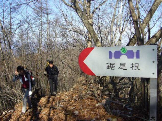 上和田行きのバスを猿橋駅で捉え、自由乗降区間なので小寺バス停の先に「佐野峠」を指し示す道標が立つところで下車。あたりはまだ秋の気配が残っていますが、上を見上げると高いところは完全に落葉しています。日陰はひんやりしています。「ひと りずつ通行」せよと看板のある葛野川に架かる橋を恐る恐る渡り、道なりに登っていくと一軒家にぶち当たり番犬が威勢良く吠えまくっているので、なんだか気圧されて右往左往。道が不確かなので、しっぽを巻いてまた橋まで戻って、もうひとつの道を 左へ入るがこれでは佐野峠に行ってしまう。再度引き返し、犬を無視して一軒家への道をまた辿ると家の左側を回り込むようにトレースがあり、控えめな手作りの道標もありました。暫くは尾根の東側をトラバース気味に登ると、やがて九十九折りとなって尾根筋を上がるようになります。尾根自体は一本調子の急勾配ですが、道は適度な傾斜が保たれていてかなり登りやすい。1時間で標高差およそ450mを稼ぐことができました。 小休止してまた少々登ると左手に林道が見えるようになり、尾根から外れてトラバースすればそこが西原峠。目の前の林道は以前来たとき⇒(こちらをご覧下さい)よりも自然に返っているような感じ。ここから東へ更に林道は延びていますが、とりあえず忠実に尾根を辿って大寺山を目指します。だらだらした登りには一応トレースはあるものの、左右の木々の小枝が道を塞ぎ、夏だったら鬱陶しいところ。小寺山と思しきピークには何の標識も無いのでそのまま通過し、いつのまにか大寺山に到着。「セーメーバンのように何の変哲もないピーク」と伊藤さんが言うように、尾根上の単なる瘤のような山頂ですが、辺りの木々はすっかり葉を落とし日溜まりになっていて休むには好都合。もうこの時期、日陰では立ち止まる気がしません。 ここからは約100m下降し、またほぼ同じだけ登り返すことになります。いままでの楽な道と違い、真っ直ぐ下り、真っ直ぐ登るので結構堪えるところ。でもちょっとだけ我慢すれば、三ツ森北峰の大展望が待っています。前回⇒(こちらをご覧下さい)に較べるとなんだか一層眺めが良くなった感じ、まわりを伐採したのかな。ともあれここで大休止。富士山をはじめ、南側の殆どの山が一望できます。眺め最高である分、風が強くてなかなかお湯が沸きません。随分と長居してしまいました。一応、予定の空白部分をトレースして目標を達成したものの、まだ長い下りが残っていて行程の半分しか来ていません。気を引き締めて岩っぽいピークを2つクリアすると尾名手峠で、ここからは麻生山を巻きながら長尾根を下ります。この尾根、長いだけあって総じて緩やかで、しか もふっかふかの落葉のじゅうたんが続き、なんとも気持ちが良い。約2時間の下りも全く苦になりません。このとき頭の中でかかった曲は「ラデツキー行進曲」。山を下りながら行進曲とはちょっと変な感じもしますが、ふかふか落葉のおかげでそれだけ リズミカルに下れたということでしょうか。 下りきったところが駒宮の集落。バス通りへ抜ける道を探して集落の中を少々迷いましたがなんとか富岡バス停に到着。時刻表を見れば次のバスはまだ2時間も先(T_T)ということで携帯でタクシーを呼び、その間、高野氏が調達してきてくれたビールを飲みながら今日の山の余韻に浸りました。程よい時間でやって来たタクシーに乗り、そのまま大月「よしの湯」へ横付け。充分に身体を温めたのち、大月から立川へ移動、鵜飼、高野両氏にとって念願(?)だった蕎麦屋「しぇ・もと」(改装して随分と綺麗になってました)に入店し、いつものようにつまみと蕎麦と、酒をしこたま頂きました。今回、山の中ではカサカサと落葉を踏みしめる自分の足音がずっと鳴り響いていました。 本日の実働時間:4時間40分 本日の累積登高差:1,017m 本日の踏破距離:10.5km |