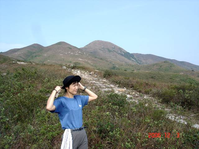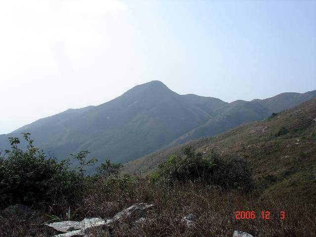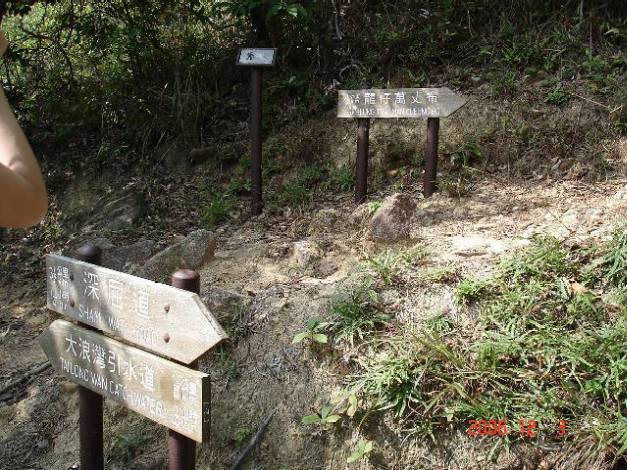 ここはLTT-5-のスタ−ト地点でもあるが、我々はトレ−ルコ−スを外れ“觀音山”(Kwun Yam Shan)や“羌山”(Keung Shan)の麓の林道、“羌山郊遊徑”(Keung Shan Country Trail) を行く。この郊遊徑はアップダウンも少なく、木陰も多い夏向きのハイキングコ-ス! LTT-5-は“觀音山”や“羌山”の尾根道コ−ス、一方海岸線に沿ったLTT-8-。“羌山郊遊徑”はこのLTT-5-と-8-の間を走る山麓コ−スだッ! “觀音山”の中腹を廻り込み左手の“石壁水塘”(Shek Pik Reservoir)や“鳳凰山”(Lantau Peak)を眺めながらの歩きが約一時間。そのまま下に降りたら海岸線沿いの“大浪灣村”(Tai Lomg Wan Tsuen)やLTT-8-に通じる交差地点に到着。 そこから右折、今度は登り坂になって汗ダクになって峠に着くと交差標識点。ここから右に進むとLTT-5-の“羌山”の麓近くに行き着くが、我々は左手西側に続く“羌山郊遊徑”を引き続き歩く。再び山中腹、左手に海を眺めながらほぼ平坦道ながら、所々沢に下ってまた登ったり、曲りくねった山道が延々と続く。最後は“霊會山”(Ling Wui Shan) の西側麓、“分水アウ”(Fan Shui Au) 手前の峠に到着。そこからいよいよ“深坑瀝”へ至るル−トに入る。広大なランタウの山並みにウットリしながらの高原歩き。山裾を廻り、やがてなだらかな登りが峠まで。そこが“大[石勘]森”の肩付近で、右へ登ると“大[石勘]森”へ至るが、先ずは山麓の高原を直進して"深坑瀝"の麓まで。目前から頂上までのル−トは無かったが雑草を掻き分けて頂上アタック! 頂上430mからの香港最西端の展望は"素晴らしい"の一言に尽きる。ここから先は≪後半≫へ。 (注:LTT-5-,-6-,-8-:Lantau Trail (鳳凰徑) Stage-5-,-6-,-8-) |
