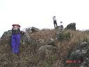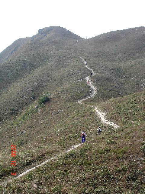 ↓往きのフェリ−の中【写真No.01】、高速フェリ−は30分で“梅窩”着、埠頭前バス停【02】。バスは大佛がある“昴坪”(Ngong Ping) 行きでも“大澳”行きでも良いが、我々は観光客で混雑する“昴坪”は避けて空いている“大澳”行きのバスに乗って約40分、“羌山道”(Keung Shan Rd.)の峠を少し越え“大澳道”(Tai O Rd.)で途中下車。この手前は三叉路で向かって直進下りが“大澳”方面に向い、右手が“深屈道”(Sham Wat Rd.) と“天壇大佛”の“昴坪”に至る“昴坪道”(Ngong Ping Rd.)。バスを降りてちょっと戻ると左側に“鳳凰徑”(Lantau Trail)のゲ−ト、この道路を挟んで右側がLTT-5-のスタ−ト地点だ。そこの上の東屋で出発前の記念写真【03】。階段を登り出す、、、カ−ブした階段を登って行くと道は左右に分岐する最初の標識【05】。LTT-5-はこれの右側、標識の“萬丈布”(Man Cheung Po) 方面を目指して登ると先ず“觀音山”へ至るが、“羌山郊遊徑”は直進、即ち標識【06】の“狗嶺涌”(kau Ling Chung) 印水道を目指す。左下手には先ほどの“昴坪”へ向かうバス道路【07】 ↓いよいよ“羌山郊遊徑”の長〜い歩きの始まり! 山中腹の道を行く途中、バックには“鳳凰山”(Lantau Peak) の勇姿【08】と、その右前方下には先ほどバスで渡ったダム堤防の“石壁水塘”(Shek Pik Reservoir)【09】、、、森の中を行くかと思えば突然視界が広がったり、、、曲りくねった山麓ル−トを行く、、、そして、たくさんのカズラ? が垂れ下がる小さな沢を通過【13】。 ↓木立を抜け、カ−ブと小さなアップダウンを繰り返しながら山麓の歩きが続く、、、左手の視界が開け“大浪灣”(Tai Long Wan)【16】を見下ろしながら小休止【17】、、、再び木立の中の歩き、、、その後ル−トは一旦下り坂になって小さな沢を通過【19】、、、この後、なだらかな登り坂を登って行くと三叉路の標識点に到着【20】。ここを直進すれば階段を下って“大浪灣村”やLTT-8-に下り着くが、我々は標識の“龍仔,萬丈布”(Lung Tsai, Man Cheung Po) 方面に向かって右折、右手の岩山肌を見ながら坂道を登り出す。 ↓なだらかな登坂ながら結構きつい! 折り返しカ−ブを二回登りつめた所に次の標識点【23】。ここまで4.5q。小休止の後、ここから右に進むと“羌山”の麓近くでLTT-5-に合流するが、我々は標識の“狗嶺涌”、左手西側へ向かって“羌山郊遊徑”を引き続き歩く、、、また沢の横断、苔が生えた岩、チョロチョロ流れる冷たい水【25】、、、またまた左手の視界が開け若干ガスってはいるが“大浪灣”方面の素晴らしい景観が広がる【26】、、、前方左下に見えてきた“狗嶺涌”の岬とLTT-8-の舗装路【28】 ↓正面には雄大な“霊會山”西側の稜線【29】とその中腹を走る“羌山郊遊徑”。ル−ト脇の白い花に癒され、涼風も心地よい! さらに前進、、、今度はかなり大きな水なし沢を横断【33】、その後が又なだらかな登坂が続く【34】、、、この辺りから木陰の道は途絶える。 ↓そしてやっと着きました“羌山郊遊徑”の“分水アウ”に繋がる交差地点【36】。ここまで6.75q。ここから左へ行けば“狗嶺涌印水道”への下り道【37】、右へ登れば“分水アウ”へ至る。この先の丘で小休止【38】。ランタウ島最西部の山並みが大きく広がる景観! 西側の“分流頂”(Fan Lau Teng) に連なる目指す“深坑瀝”【39】、後ろ北側には“霊會山”【40】。ここで仲間の一人が所用で中途帰還、、、この後“分水アウ”までの登り坂を行く【42】 ↓“分水アウ”手前の分岐点、右(北側)に進めば“霊會山”、萬丈布”方面へ【44】、左(西側) が目指す“深坑瀝”やその先の“狗嶺涌(西)”へ至る【45】。我々は左側へ、、、チョット登ったら壮大な光景が待っていた! 後ろには“霊會山”とその左手“萬丈布”方面へのル−ト【47】、正面には“大[石勘]森”【48】。その左手、“大[石勘]森”の肩付近の峠までの坂道ル−ト【49】 ↓峠までのジグザグ登坂【50】、、、ガレ道を登り切って振り向けば今まで歩いて来たル−ト【51】、この辺りがランタウ西の一番雄大な景観! 峠まで登り着いたらその右側が“大[石勘]森”だが、そのまま直進【52】、、、大きなカ−ブを曲がると正面に見えてきた“深坑瀝”【53】、まだかなりの距離。山裾の曲りくねった道を行く、、、草原に屯する牛チャン【55】、、、“深坑瀝”を左手に見ながら大きく迂回する地点まで来て正面に見えてきた海と岬は“分流角”(Fan Lau Kok) らしい?【56】 ↓左真上の“深坑瀝”、迂回ル−ト途中に標識が有ったが、頂上へのル−トは見当たらない? 標識手前の草むらから適当に足を踏み入れ頂上アタック開始【57】、先頭部隊はもう頂上近くだ! 右に廻り込みながら急登坂、、、頂上直下の大岩の脇を這い登って【59】、、、やっとこさ着きました香港最西端“深坑瀝”430m頂上! 三角点は壊れていた。頂上からの眺め、南東方面の“狗嶺涌"の岬と“大嶼海峡”(Lantau Cannel)の大海原【60】。北東には雄大な山並みの向こうに“霊會山”【61】。そんな風景をバ