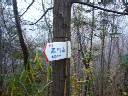 【08】今日は雨具なしには歩けません。 【09】尾根の途中から見る田野倉の街。 【10】小さなピークをいくつも越えていきます。 【11】このピークには「峯山」という名前が付いていました。 【12】可愛い道標が鈴なりです。 【13】雨はシトシトと降っています。だんだん気分がへこみます。 【14】ピークはまだまだ越えなくてはなりません。 |