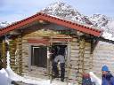 【09】休憩中。 【10】峰ノ茶屋が見えてきました右の山は剣が峰。 【11】峰ノ茶屋到着。バックは剣が峰と朝日岳。 【12】今日は大倉山、三倉山も見えてます。 【13】噴煙を上げる茶臼岳。 【14】峰ノ茶屋避難小屋の冬季入口はこうやって入ります。 |