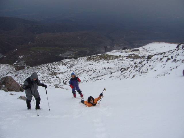 【16】大倉山、三倉山は雪が付くとかっこいいです。 【17】なかなか見事なエビのしっぽです。 【18】野口先生による雪上訓練。 【19】ちょっと楽しめる斜面です。 【20】茶臼岳山頂にて。 【21】峰ノ茶屋からの下り。 |
