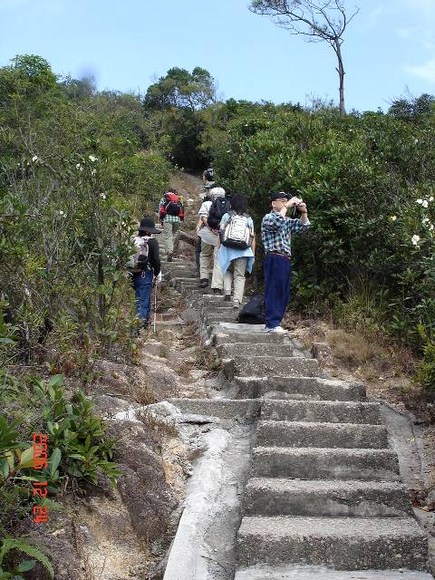 ↓WSTとHKT入口ゲ−ト前で出発前の記念写真【写真No.01】、ゲ−トを潜っていよいよ"渣甸山"までの登り坂だッ! 階段をしばらく登ると視界が開け左右の風景を楽しみながらの歩き。左手西側に見えた“聶高信山”(Mt.Nicholson)【06】、 階段途中の大岩の上【07】から振り返り見ると、、、 ↓南側の“深水灣”(Deep Water Bay)方面【08】、そして目前の“陽明山荘”【09】。さらに登り坂は続き、、、やがて"渣甸山"頂上433mに到着【11】。正面に“Victoria Harbour”、その昔ジャーディン・マセソン商会が貿易船の入港を監視していたと云われるこの地点、今日の天気は概ね晴れてはいるがガスっぽい! その左“セントラル”方面【12】と右側には対岸の“九龍サイド”【13】。そして三角点で記念撮影。 ↓次の目標“畢拿山”を目指して東に向かって下山開始【15】、ここからの下りは段差の高い階段続き。正面の“石礦場”(石切り場)【16】を見ながら下って行く、、、この石切り場はずい分以前から石を切り出してる様だが、またこの辺りまでアパートが立つんだろうか? 下まで下ったら、またあの石切り場横の階段を登らなければならない!【19】 右手に見えてきた“大潭水塘”(Tai Tam Reservoir)【20】。先頭部隊が石切り場横の階段途中で待っている【21】 ↓階段を下り終えた所【22】、そこに立つ標識と⇒“標距柱”(Distance Post)【23】。今度は石切り場右手のまたまた段差の高い階段登りが続く!、、、ここはHKT-5-とWST-2-が重複するル−ト【26、27】、、、段差の高い階段が終わった所で小休止【28】。 ↓振り返り見れば先ほどの“渣甸山”と下山ル−ト【29】、正面には今から向かう“畢拿山”とその左手彼方に“柏架山”(Mt.Parker)のレ−ダド−ム【30】。しばらくなだらかな中腹歩きが続く、、、まもなくHKT-5-とWST-2-が分岐する地点【34】を通過、因みに北側のWST-2-の方へ向かうと“小馬山”(Siu Ma Shan) へ至る。いよいよ“畢拿山”への最後の登り!【35】 ↓登り坂途中、ここに来てガスも薄くなりクリアになった左手の九龍サイド【36】、、、最後の竹林石段【38】を登ったら“畢拿山”頂上436m【39】! 今日は沢山のハイカ−達で賑っている。以前はこんな立派な標識は無かったぞ〜?【41】、三角点の傍で記念撮影。 ↓しばし風景を堪能した後いよいよHKT-5-の終点“大風アウ”を目指してまた階段下り!【43、44】、、、そして、、、着いたッ-! お馴染み“大風アウ”の東屋【45】、これで今日の"登り"は終わり! ここの広場はいつも大勢のハイカ−や行楽客でイッパイ! しばし休憩の後今度は“柏架山道”の舗装道路【49】を下り始める。 ↓ルンルンで舗装坂道を下って、、、最初の右折路“康柏郊遊徑[5]”(Hong Pak Country Trail No.5) には入らずに更に下ると、、、やがて管理事務所の傍にある火災警告板【52】、湿度が70%台の時は指針がレッドゾ−ンになるのか? と考えながら次の右折路“樹木研習徑”(Quarry Bay Tree Walk)【53】から山道に入る。因みに“柏架山道”の舗装路は最後まで下ると“[魚則]魚涌”(Quarry Bay)へ至るが、先の“康柏郊遊徑”か、ここ“樹木研習徑”へ入るといずれも最後は“太古”へ辿り着く。森の中の小道、、、左手に戦時中作られたと云われるカマドの跡【55】を通過、、、小川を渡って、、、 ↓間もなくもう一箇所の下段のカマドの跡【57】を奥へ進んで、、、この辺りから石道となり、、、森の中の歩きが続く、、、やがて“康怡花園”(Korn Hill)の近く【61】、、、沢を渡り、、、 ↓いつも出発時の記念写真を撮る“Quarry Bay Extension”の大標識【64】から左折階段を下って、、、WST-2-終点の標識【65】、そこはもう市街地、“康怡花園”の車道【66】を下って“太古”へ到着。MTR駅前ショッピングモ−ル内、仲間の案内で初めての中華店にて飲茶で最後の〆でした。 |