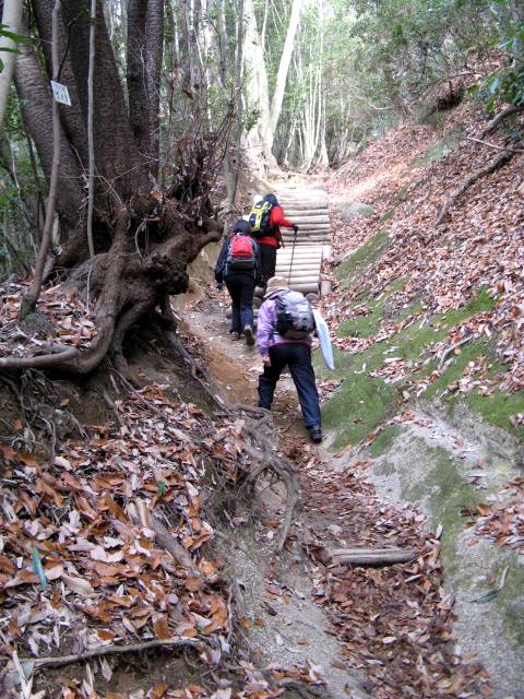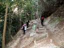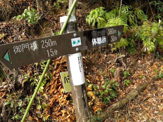 ↓これが“猿投神社”正殿【写真No.01】、ネット資料によるとこの辺りではかなり由緒ある神社らしい! 境内【02】に入って登山の無事を祈り、その絵馬の前で出発前の記念写真【03】。沢山の絵馬はトヨタ関連企業のものが大半! 09:15境内の右横手からいよいよ出発、右手の“猿投川”の脇、舗装小道を行く【04】、、、ちょっと行くと右手に“大悲殿”の社【05】と登山ル−トの標識板【06】、その左側の道【07】を進んで、、、 ↓こんな標識【08】を見ながら更に行くと小橋の脇に小屋と鉄製の水車が廻っていた。09:30、これが“トロミル水車”【09】。説明文によると、いわゆる“せともの”で有名な隣の“瀬戸市”に送る陶磁器の原料を作るためのトロミル(攪拌機)とか? 原料はこの近辺で産出される“サバ土”と云う土らしい? 元気に歩く女性軍【10】、、、09:40、その先にはこんな岩も【11】、、、ここは車道で時折車も通る、、、“猿投山”山頂まで3.4q、1時間40分の標識【12】、その先の左手に階段、ここが山頂への登山口【13】、階段を登り始めて直ぐにあった“御門杉”【14】、09:44。 ↓いよいよ丸太で滑り止めされた急階段の登坂【15】、、、一しきり登って平道になりホッ!【16】、、、花を眺めながら再び階段だ!【18】、、、またしばらく登りが続き、、、そして舗装路と合流【19】、ここは工事中の林道だった。そのまま突っ切るとこんな標識【20】、休憩所まであと30分!、、、しかしまたもや階段【21】 ↓目指す最初の目標“東宮”まであと2.0q【22】、、、しばらく平道、森の中の歩きが続く【23,24】、、、木の上には鳥類保護の鳥籠?【26】、、、今度はガレ道登り【27】、、、そしてまたもや丸太の階段【28】、、、 ↓10:10、やっとこさ着ました休憩小屋!【29】、ここで小休止【30】。下の“トロミル水車”小屋の説明で読んだ陶磁器の原料“サバ土”とはこんな土のことでした【31】。10:20、さぁ〜出発、、、元気を出して再登坂【32】、、、途中の標識【33】の“武田道”とは後で分かったが、今の登っている東側のル−トと、帰路の西側下山ル−トとの中間のル−トらしい? 平道と階段の繰り返しが続く【34】、“東宮”まであと1.3q【35】 ↓ここからしばらく進むと右手の土手の上に大きな岩がゴロゴロ【36】、ちょっと上がって見たら今までで初めて視界が開け、東側の岡崎方面らしい? 遠望【37】。元のル−トに戻って【38】また登りが続く、、、間もなく10:40、“東宮”と“西宮”との分岐点に到着【39、40】、、、ちょっと下ったら舗装道路に合流した【42】 ↓先ほどの“武田道”はこの舗装路から始まるらしい?【43】、そしてここから“東宮”まで残すは1km【44】。またこの舗装路を右手に行くと展望台に行ける様だが、我々は寄り道せずに左手に進んで10:45、小広場に到着。分かりやすい案内板【46】と“東宮”への鳥居【47】、そしてトイレも完備【48】。左手の舗装路は“西宮”方面へ向かう下山路だ! この山は標識、各種案内板も豊富で懇切丁寧! 樹木や草花、そして鳥類の説明【49】など、愛知県に来て初めて登った“本宮山”と同じだ! 残念ながらこちらは鳥は鳥でも“焼き鳥”しか興味ないけど!(^_^) ↓“東宮”への鳥居を潜って少しの階段登りから今度はダラダラ登坂、行き交うハイカ−も【50】。傍にはこんな大木【51、52】。補修工事中の坂道を登り【53】、目指す“東宮”まであと100m【55】、そして11:15到着【56】。境内の大木はなかなか立派なものだ! ↓“東宮”本殿の様子【57】と傍には“世界人類が平和でありますように!”の有り難い立て標識【58】。神社の左手からこんな鉄の小橋【59】を下って再び林の中の歩き【60】、、、左手の杉林【61】を眺めながら進んでいたらネズミのような岩!【62】、、、そしていよいよ“猿投山”山頂まで残すは10分、400m【63】 ↓あれだけ長かった階段登りがもう終わったようだ、と思ったら身も心も軽くなってスイスイと前進【64】、、、最後の階段を数段登る途中、左手の陽だまりで数人のハイカ−達が昼食を摂っていた。何でこんな見通しが悪い変な場所で昼メシ食べてるのか? 陽だまりで暖かいからかな? とか考えながらそのまま上まで登ったら小さな広場とこんな標識【65】、オマケに三角点らしき石標も! 頂上にしては最後の標識【63】を通過してからまだ10分も経ってないぞ? しかし頂上かも知れないので写真を、とセルフタイマ−をセットしたが!【66、67】。通りがかりのハイカ−に聞くとやっぱりここは頂上ではなかった、どうやら頂上への稜線上のようだ。そのまま左手に進んで【68】、、、遂に“猿投山”山頂628.9mに到着【69】、この時11:40、“猿投神社”をスタ−トして約2時間半かかっていた。山頂はご覧のようなちょっとした広場、西側の“瀬戸市”との境界線上だ!【70】 ↓国土地理院の立派な一等三角点【71】、北側のみが展望が開けている。晴れてはいるがもの凄く寒い! 気温1度、おまけに冷たい強風の吹さらし! 遥か彼方には写真では見難いが“