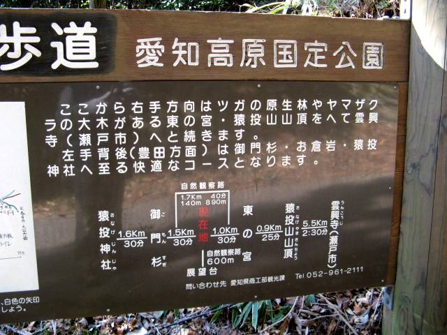 “猿投神社”の境内に入ってみると日曜のせいか、何かの催しが有るのか? かなりの人達! 登山の無事を祈っていよいよ出発。しばらく舗装小道を歩いて途中から山道に分け入る。“猿投神社”と共に“猿投山”もポピュラ−な山の様で至る所に案内標示が完備されているから安心して歩ける、だからハイカ−も結構多かった。しばらく階段の急坂登りが続き、杉林の中を登って行って舗装された林道と合流。その後も平道と急坂登りの繰り返しが続きやっと最初の休憩小屋に到着。そこから更に登りが続いて“東宮”と“西宮”の分岐点から“東宮”を目指しての登り。 再度舗装林道に出た所が“東宮”への入り口鳥居、相変わらず鬱蒼たる森の中の登坂を行ってやがて“東宮”境内に到着。ここから先、頂上はそう遠くはない。一旦下りまた登り坂だが今度は傾斜が軽い、そしてチョット登った所の林の中の三角点紛いの石標が有ったので頂上かと思いきや? そうではなかった。そこはどうやら頂上稜線上で、そこからもう少し先が本当の頂上だった。頂上には一等三角点も有り、北側のみが展望が開けた小広場、遠くには“白山”らしい雪の尾根、北東にはあの“御嶽山”の雄大な山頂も! しかし気温1度、冷たい強風に居たたまれず早々に山頂を退散した。 |