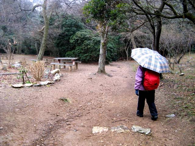良く整備された綺麗な公園の“権現の森”からいよいよ登坂、緩やかな階段登りの途中から右手の“健康の道”と呼ばれる脇道へ入ってみたが、どちらもダラダラ登りル−ト。しかし直ぐに“冒険の道”と書かれた狭い山道が有ったのでそちらを行くことにする。途中ちょっとだけ急坂ル−トだが、やがて五合目に出て正規の登山ル−ト“健康の道”に合流。しかしこの頃、小雨がパラツキ始める。そのまま緩やか登りを経て八合目の“蔵王権現”の社と小広場。あとは社の裏手の芝生の中を登って行って舗装道路と合流、その上が頂上の駐車場と4階建ての立派なレストハウス、それに風力発電の風車が一機廻っていた。レストハウスの4階は360度の景観が楽しめる大展望台! ただ今日の天候では三河湾が見えただけ。天気が次第に悪くなっきたので早々に頂上を退散、下山を急ぐ。 往路の“健康の道”をそのまま下って五合目からも引き続き正規ル−トを下る。途中の“熊野三所権現”を経てスタ−ト地点の“権現の森”へ下山し終えた。東屋で雨宿り兼昼食を済ませ市街地へ。往路とはちょっとル−トを変えて“田原城跡”“田原町博物館”の横を通って最初の“三河田原”駅まで帰り着いた。往復約8km! この間、頂上からずっと傘差し歩きだった。再び豊鉄に乗って“豊橋”へ、そして名鉄での帰路の途中、“国府”辺りまでは雨が降っていたがその後、車窓の景色が雨から雪に変わってきたのにはビックリ! 電車が名古屋方面に向かって西へ進むにつれ外は完全な雪化粧に変わっていた。自宅がある“新安城”を朝出発する時は薄曇だった天気が、わずか6時間ほどで大雪になるとは! |