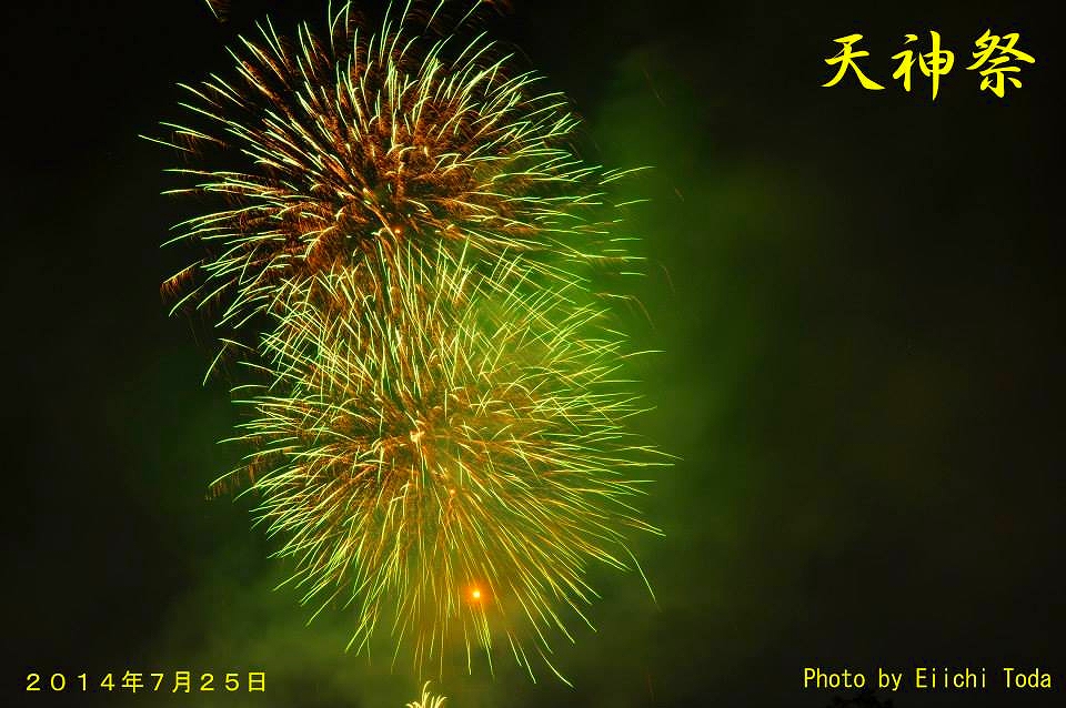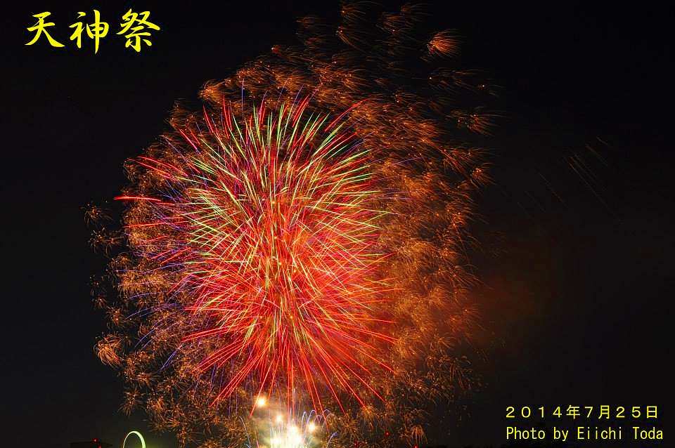 7月25日,天神祭花火写真集のダイナミックな花火をご覧ください。 ※ダウンロードフリーですが、原則として一次利用に限ります。 (PC壁紙・スマホ待受け用などはOK!) それ以外の二次使用目的の場合は、著作権者(撮影者)に許諾を得てください。 著作権者宛て⇒MAIL